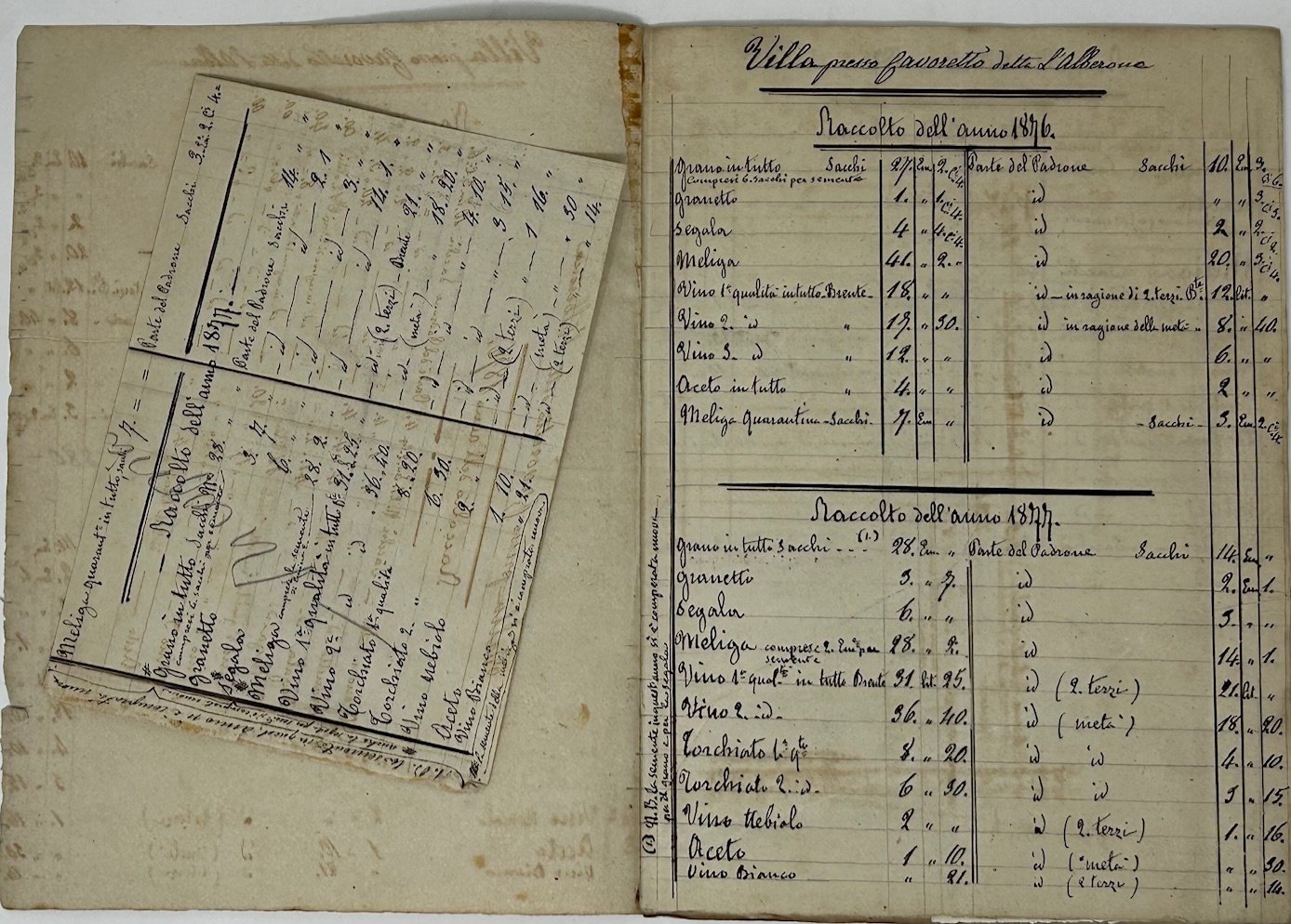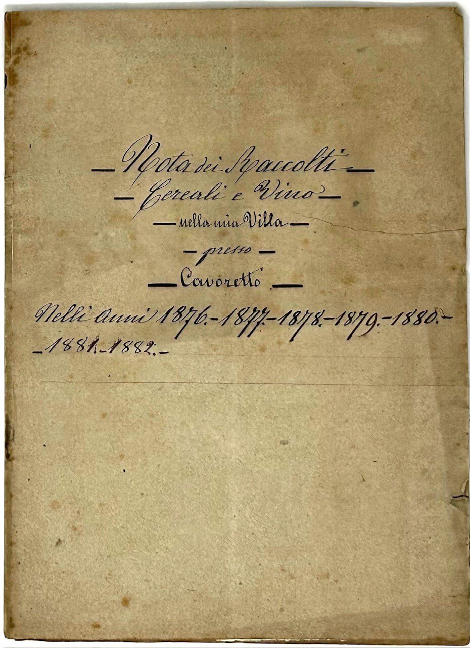 >in-8 (mm 220x150), pp 10 (compreso il foglio di titolo). Interessante libro dei conti per gli anni 1876-1882, appartenuto ad una villa sita nella collina torinese di Cavoretto detta l'Alberone. Il raccolto risulta suddiviso tra mezzadro e padrone in una percentuale equivalente alla metà o ai due terzi del prodotto. Il territorio coltivato produceva: grano, granetto, segala, meliga, Vino Brenta 1a/2a/3a qualità, aceto, Torchiato, vino Nebiolo, vino bianco, miglio, biada. "Raccolto dell'anno 1879: grano, granetto e segala, fallito il raccolto a causa dell'innondazione. La poca parte di grano spettante al padrone venne regalata ai massari". Interessante documento testimonianza di antichi vitigni della collina torinese ormai estinti.