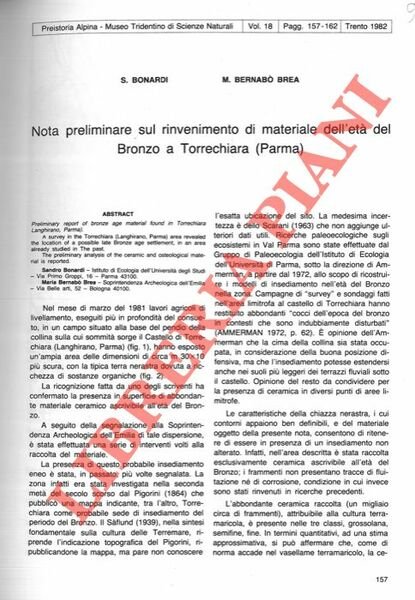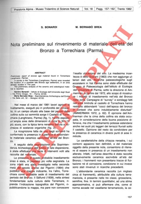 Nota preliminare sul rinvenimento di materiale dell'età del Bronzo a Torrechiara (Parma) .
