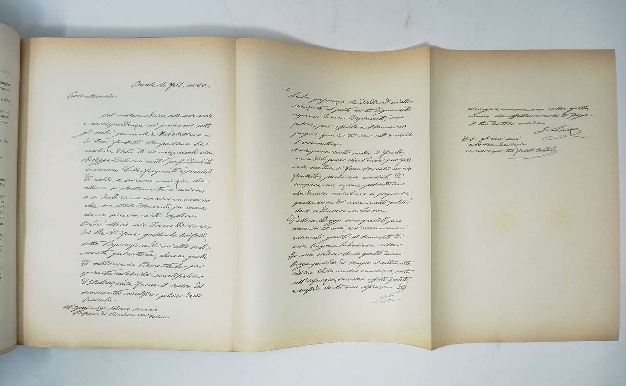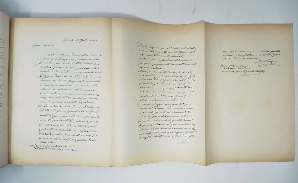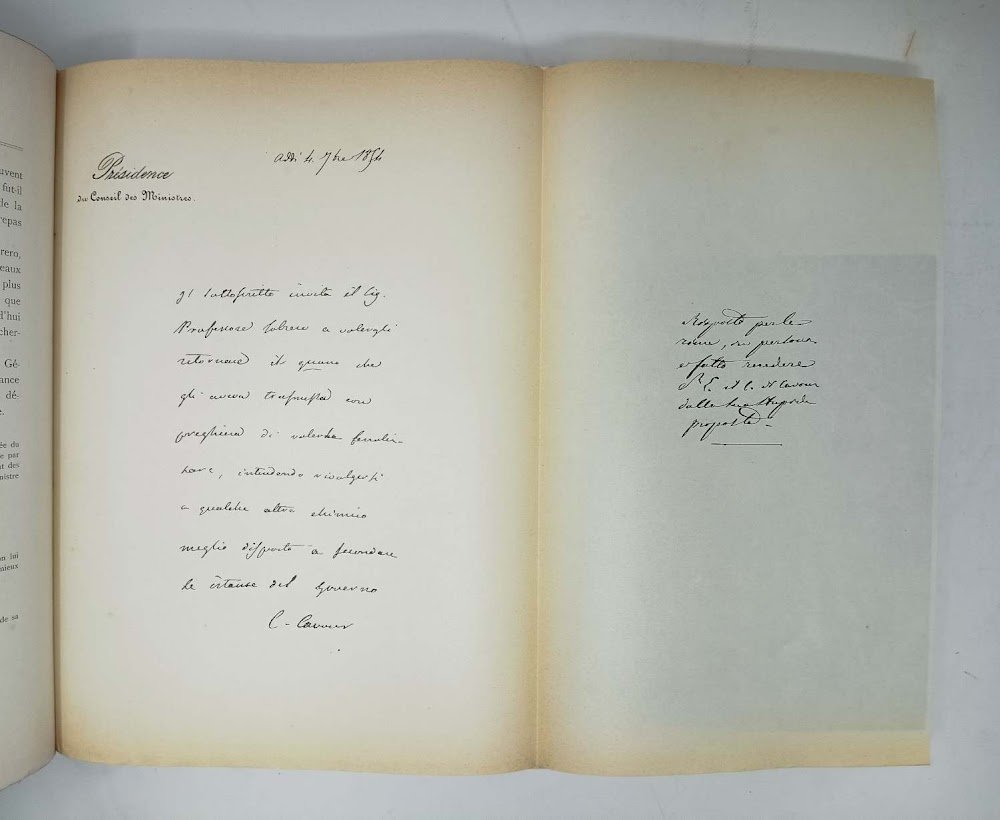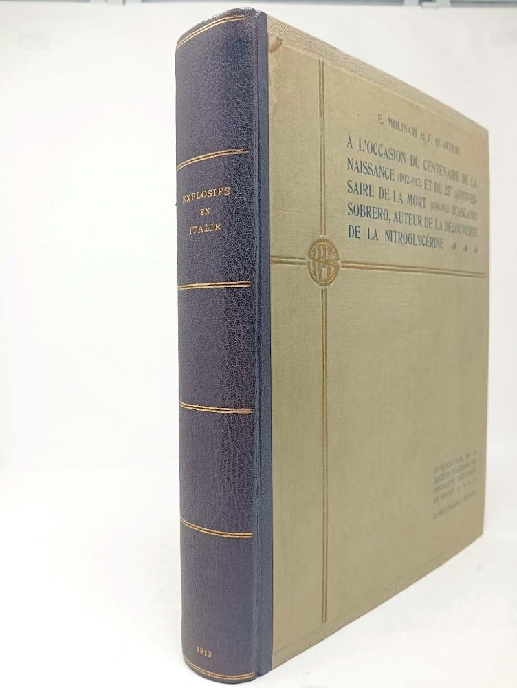 >in-4, (mm 280 x 225 x 40), pp. XIX, 306, leg. edit. m. marocchino, al piatto superiore la scritta "A l'occasion du centenaire de la naissance (1812-1912) et du 25me anniversaire de la mort (1888-1913) D'Ascanio Sobrero, auteur de la decouverte de la nitroglycérine. Publication de la société italienne des produits explosifs de Milan." In antiporta la riproduz. del dipinto ad olio eseguito da Morgani, raffigurante Sobrero; opera ornata da 96 illustrazioni, 17 tavole in eliotipia, e 18 facsimili d'autografi. Interessantissima ricca monografia dedicata agli esplosivi, alle sostanze per produrli (nitroglicerina, tritolo, clorati, perclorati), alle fabbriche che li producono, ed alle leggi che ne regolano la produzione. Ottimo esemplare.