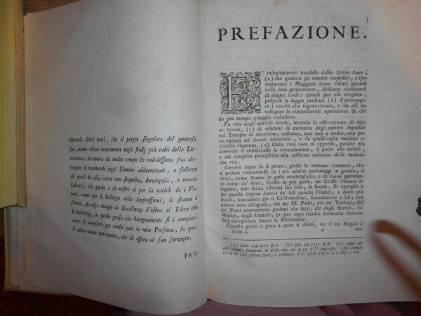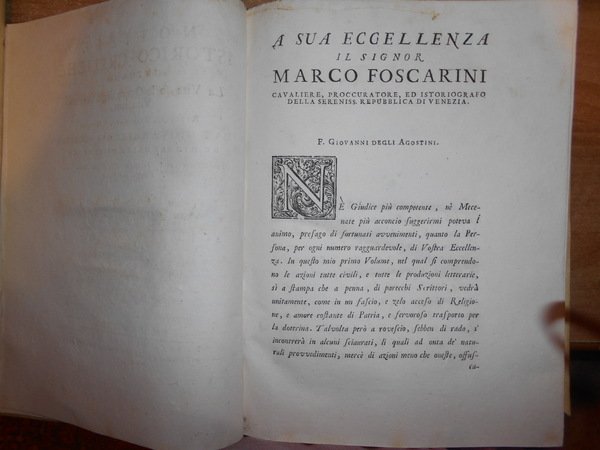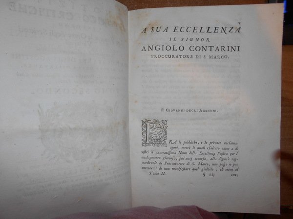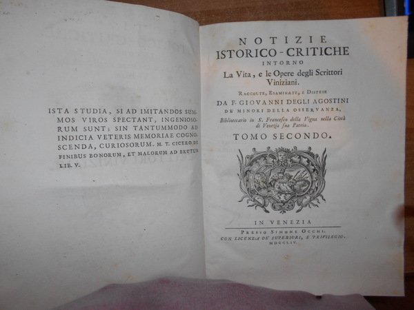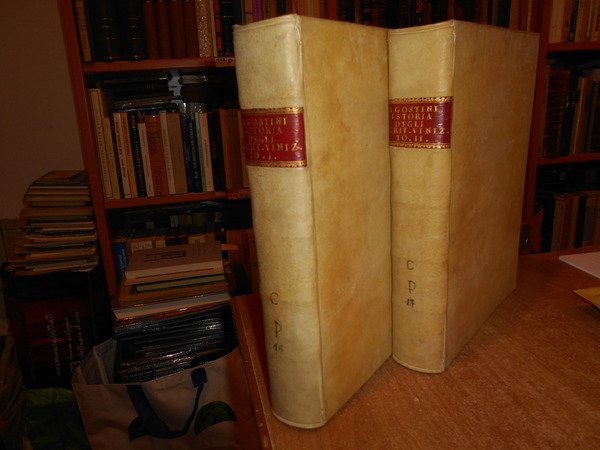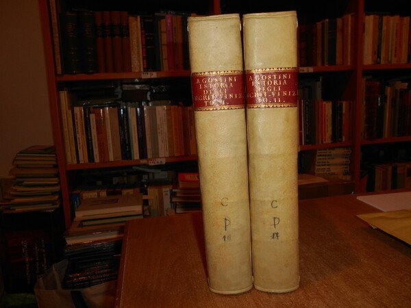 AGOSTINI, GIOVANNI, DEGLI. Venezia, Presso Simone Occhi, 1752-54. NOTIZIE ISTORICO-CRITICHE INTORNO LA VITA, E LE OPERE DEGLI SCRITTORI VINIZIANI. 2 volumi in-4°, piena pergamena coeva con titoli in oro entro tasselli in pelle ai dorsi. (8), LXIV, 623; XVI, 694, (2). Bellissimo esemplare in edizione originale co ex libris al verso dei piani anteriori. Poderosa e dotta opera che fornisce notizie bio-bibliografiche, spesso non reperibili altrove, su oltre sessanta scrittori veneziani dei secoli XIV-XVI. «Opera incompleta quanto allo scarso numero degli scrittori, onde si parla, ma preziosissima quanto alla estensione ed esattezza delle notizie». Uff. A - I - 6 - 2