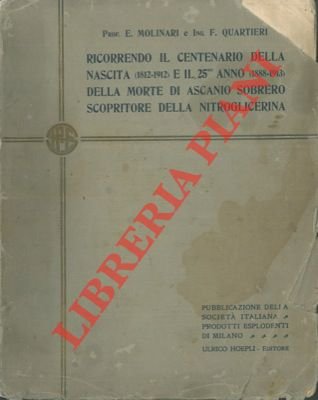 Milano, Hoepli, 1913, 4° brossura originale, strappo con mancanza ad un angolo della cop. ant. pp. XIX-291 con 96 ill. n.t. 17 tav. in eliotipia f.t. e 18 facsimili di autografi. Pubblicato in ricorrenza del centenario della morte di Ascanio Sobrero, scopritore della nitroglicerina.