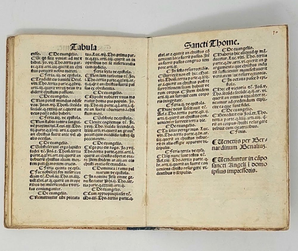 >in-8 piccolo (152x107 mm), ff. 30 (segnatura: a-f 8, g6), carattere gotico su due colonne. Legatura in cartone maculato di fine XVIII secolo (con minime mancanze). Piccola raccolta di sermoni quaresimali, di cui è nota un'edizione precedente (Venezia 1505), ad opera del domenicano inglese Robert Holkot (o Holcot, ca. 1290 - 1349), noto filosofo ed esegeta biblico, professore di teologia a Oxford e seguace della scolastica di Guglielmo di Ockham. Comprende i commenti ai peccati capitali: tra i sette, alla gola è dedicato un sermone di gran lunga più esteso rispetto agli altri. La data si ricava dalle notizie sull'attività del tipografo, infatti dopo il 1528 le sue edizioni sono tutte sottoscritte "B. Benali e compagni". Raro, censito in sole tre biblioteche italiane (Fabriano, Archiginnasio e Vallicelliana). Buon esemplare, minima gora d'umido al margine interno e inferiore, altrimenti piuttosto fresco. Dizionario biografico degli italiani, vol. 8 (B. Benali). Non in Adams.
