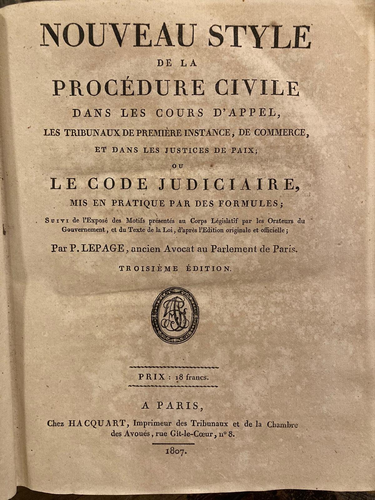 In-4 (250x 200mm), pp. XLIV, 916, legatura coeva in pelle marrone spugnata, titolo su tassello verde e fregi in oro sul dorso. Bella edizione del nuovo codice di procedurta civile napoleonico.