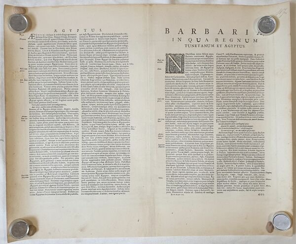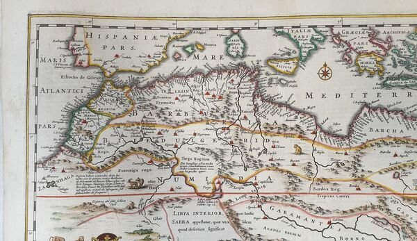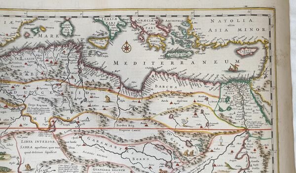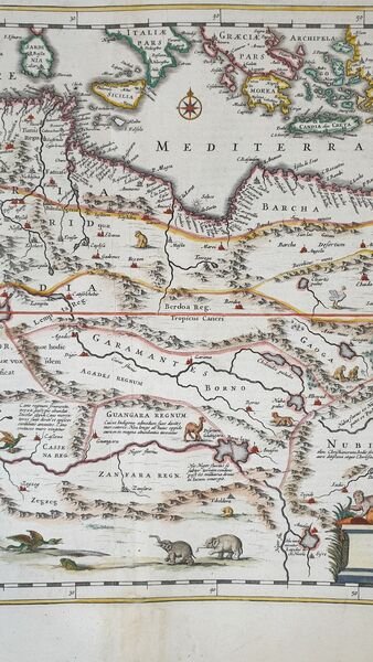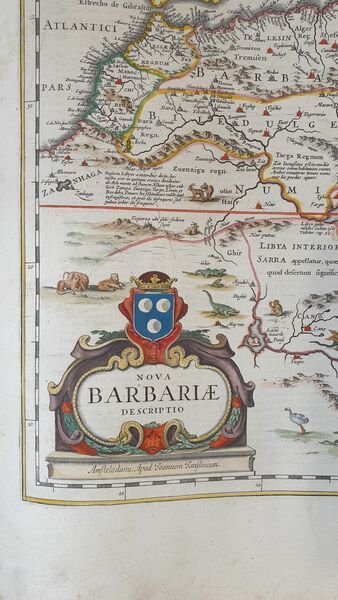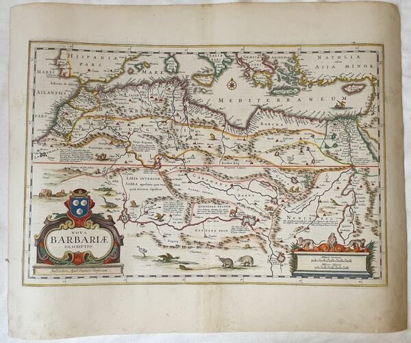 TiTOLO: “Nova Barbariae descriptio” from Nieuwen Atlas Amstelodami, Sumptibus Joannis Janssonii 1650 circa Dimensioni del foglio: 485 x 600 mm. Dimensioni dell'incisione: 355 x 525 mm. Tecnica: incisione su rame Condizioni generali: Eccellenti rare fioriture. Meravigliosa mappa del Nord Africa di grandi dimensioni acquarellata a mano tratta dall'Atlante "Nieuwen Atlas" [translation: The New Atlas], di Jan Jansson, pubblicata ad Amsterdam nel 1650 circa. La mappa mostra anche l'odierno Marocco, Algeria, Tunisia, Libia, Egitto. Titolo decorato con elaborato cartiglio e illustrazioni dell'interpretazione europea della flora e fauna africana. Descrizione completa dell'Egitto e Nord Africa in lingua latina al verso. Jan Jansson, celebre cartografo, appartenente ad una lunga stirpe di stampatori attivi a partire dal XVII secolo. Si stabilirono prima ad Arnhem poi ad Amsterdam. Furono stampatori di mappe, di libri e librai. Title: “Nova Barbariae descriptio” from Nieuwen Atlas Amstelodami, Sumptibus Joannis Janssonii 1650 circa Sheet size: 19.09 x 23.62 in; 485 x 600 mm. Plate area: 13.98 x 20.67 in; 355 x 525 mm. Technique: Copper engraving Overall condition: Excellent condition, with light foxing. A wonderful large scale hand-colored map of North Africa, from one of the great early 17th-century Atlas "Nieuwen Atlas" [translation: The New Atlas], by Jan Jansson, published in Amsterdam in 1650 circa. The map shows what is now Morocco, Algeria, Tunisia, Libya, Egypt. Elaborately decorated title and illustrations of European interpretations of african flora and fauna. Complete description of Egypt and North Africa in latin language in the verso. Jan Jansson was part of an influential family of map publishers from the Netherland throughout the 17th century and beyond. They were based in Arnhem than in Amsterdam. They were printers, publishers and booksellers. Overall Condition: Excellent