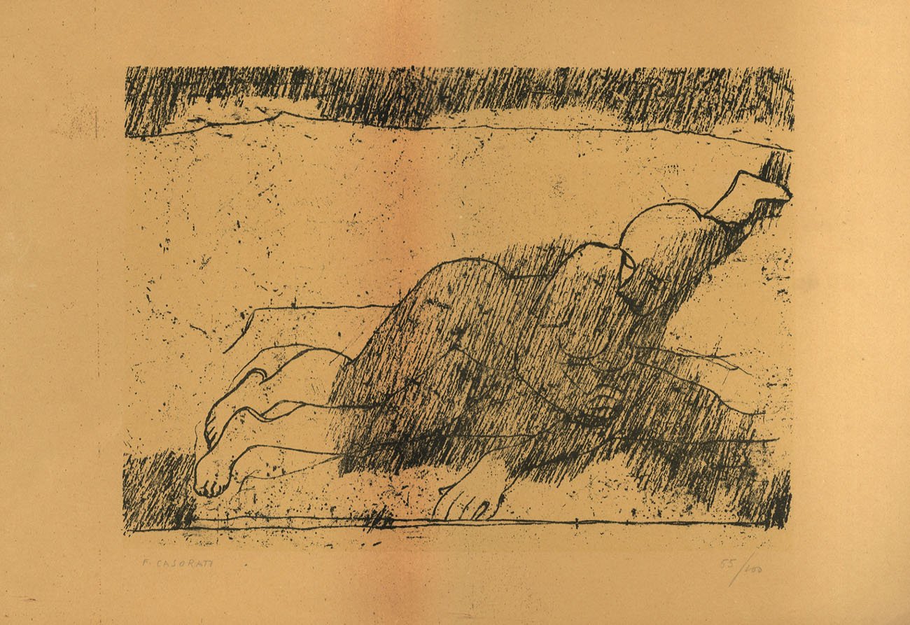 >Litografia originale (mm 500x350 ca) con la firma autografa a lapis "F.Casorati" in maiuscola a sinistra del margine inferiore, e la numerazione "55/100" a destra. Una delle dieci litografie stampate al torchio a mano, serie tirata a 100 esemplari e le lastre poi levigate. Tutte le litografie della serie sono accomunate dal tema del nudo, uno dei classici temi accademici, benché Casorati avesse frequentato legge e non l'accademia. L'attenzione al corpo umano, molto spesso nella sua nudità, rappresenta uno dei motivi da lui più analizzati lungo tutto l'arco della sua vita creativa. "il nudo di donna diviene una presenza quasi ossessiva e reiterata all'interno del suo operare; è simbolo di una ricerca e razionale ... il motto Numerus, mensura, pondus, che nella sua brevità ci da forse il ritratto intimo più aderente dell'uomo e dell'artista, aiutandoci anche nel reperire la chiave di lettura necessaria per decodificare l'attitudine mentale del suo fare pittura ... propone regole matematiche nella costruzione del corpo ... che Casorati ben conosce e utilizza quasi come schemi mentali per costruire le sue figure all'interno dello spazio dello studio o di una stanza" (Claudia Gianferrari). Impresse subito dopo la guerra, queste litografie sono rare e si trovano spesso su carte di diverse grammature e tonalità a causa della scarsa reperibilità della materia prima nel periodo postbellico. CARLUCCIO 1964 p. 304; Carluccio, Opera Grafica, n. 51.