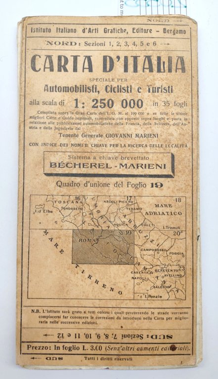 Lazio Abruzzo Campania foglio n. 19, custodia editoriale morbida con pieghe e piccoli strappi ai margini. Foglio più volte ripiegato cm 21 (chiuso) cm 42x70 (aperto) con numerosi strappi, vedere immagini. Libretto con indice alfabetico dei nomi all'interno staccato dalla carta