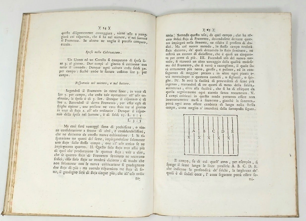 >in-4, pp. VIII, 54, (ultimo bianco mancante), legatura in pergamena, titolo su tassello al dorso, capitelli passanti. Titolo a stampa rossa e nera con vignetta xilogr., alcune testatine ed iniz. xilogr. Dedica dello stampatore al patrizio genovese Marchese Giovanni Torriglia. Con 2 tabelle a stampa ripieg. ma mancante della grande tavola inc. in rame più volte ripieg. raffig. un cavallo che traina il carro della semina col contadino, un aiutante e vari altri strumenti per seminare il grano. A pag. 27 inizia una ''Dissertazione'' sul miglioramento delle terre di Bartolomeo Mesny ''medico di S.M. Imperiale, Direttore delli Spedali militari di Toscana'' composta per i Georgofili di Firenze. Seconda edizione (la prima era apparsa a Venezia l'anno precedente) di opera assai interessante sulla possibilità d'incrementare la produzione di grano fino al cinquanta per cento e ben conservarlo. Buon esemplare, fresco e marginoso, ex libris "Marchionis Salsae (arrossature al frontespizio).