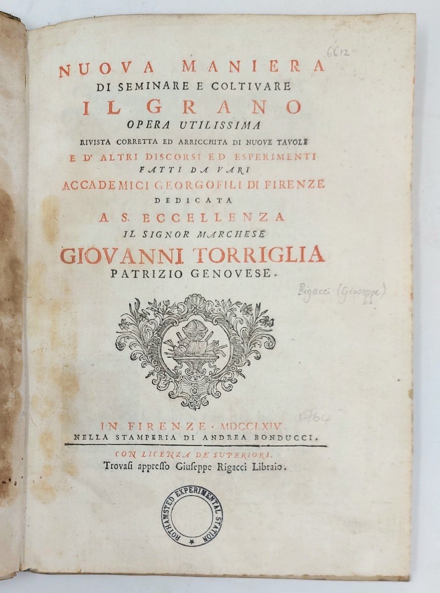Nuova maniera di seminare e coltivare il grano. Opera utilissima, rivista, corretta ed arricchita di nuove tavole e d'altri discorsi ed esperimenti fatti da vari Accademici Georgofili di Firenze.