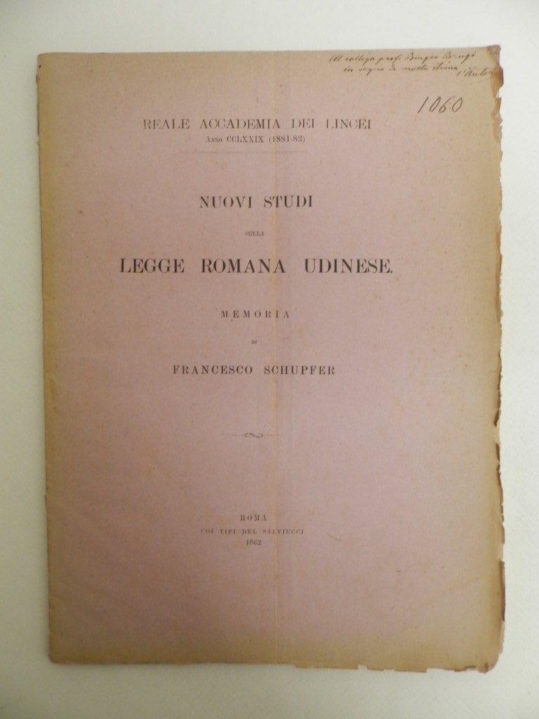 4^, pp. 60, brossura editoriale, strappetti e piccole mancanze ai margini e al dorso, una mancanza al piatto posteriore, fioriture alle carte, ma nel complesso buono stato Invio autografo dell'autore al prof. Biagio Brugi. In testa al frontespizio: Reale accademia dei Lincei. Gia pubblicato in Memorie della Classe di scienze morali, storiche e filologiche, ser. 3., v. 10, seduta del 18 giugno 1882. *** TUTTI I NOSTRI LIBRI SONO VISIBILI PREVIO CONTATTO MAIL O TELEFONO NELLA NUOVA SEDE DI MILANO: LIBRERIA COSMOPOLIS, VIA JOMMELLI, 22. ***