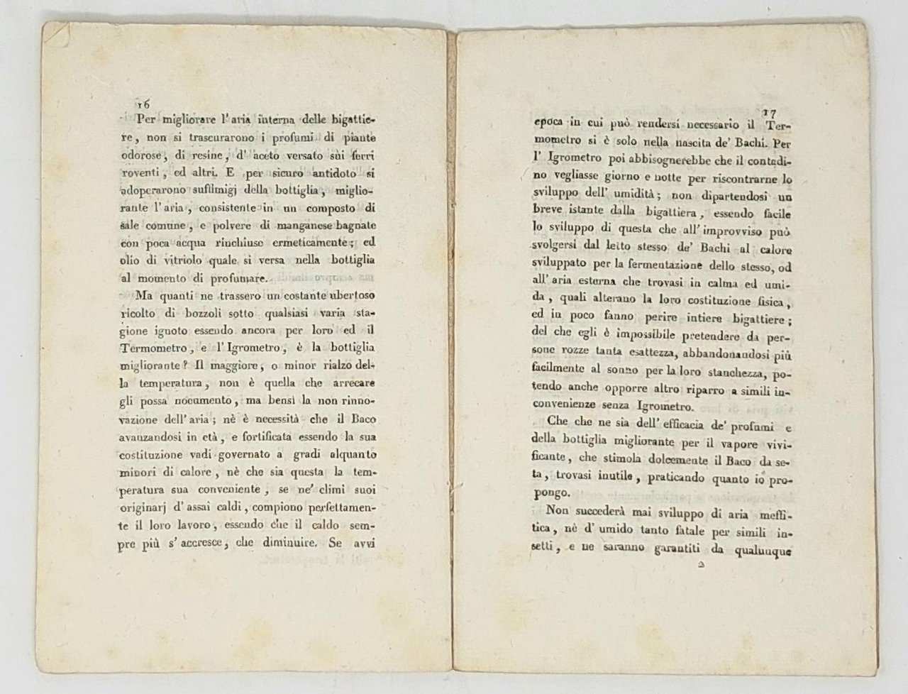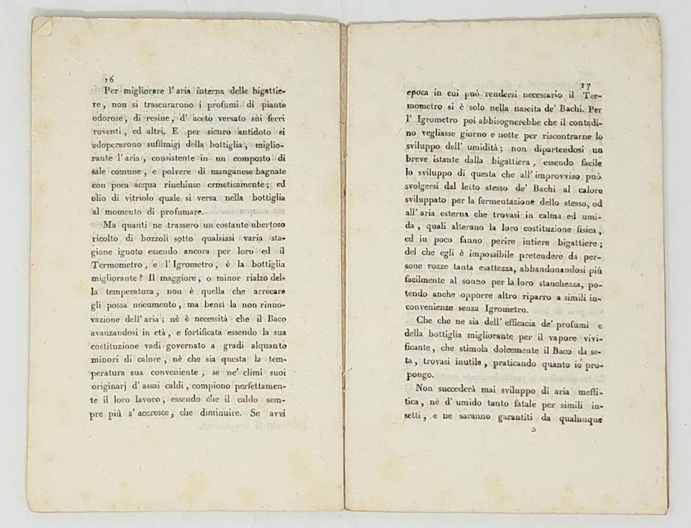 >in-8 piccolo, (183x115 mm), pp. 26, legatura coeva in cartonato rustico. Trattato con consigli pratici sull'allevamento dei bachi da seta. Edizione originale, rara a trovarsi. Buon esemplare.