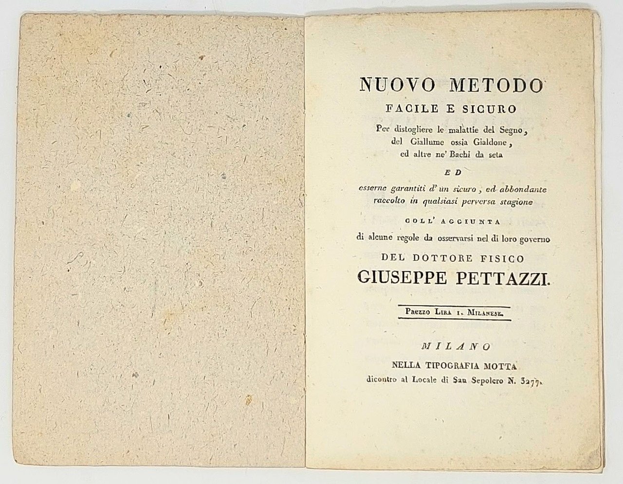 Nuovo metodo facile e sicuro per distogliere le malattie del segno, del giallume ossia gialdone, ed altre ne' bachi da seta ed esserne garantiti d'un sicuro, ed abbondante raccolto in qualsiasi perversa stagione, coll'aggiunta di alcune regole da osservarsi nel di loro governo. Del dottore fisico Giuseppe Pettazzi.