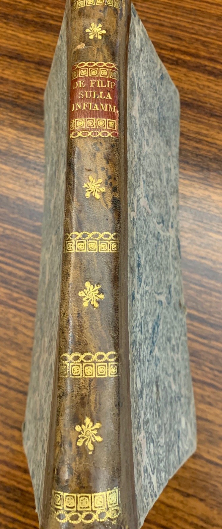 >in-8, pp. XVII, 176. Legatura coeva mezza pelle e angoli, titolo oro su tassello al dorso. Bell'esemplare con qualche leggera marginale arrossatura. Interessante monografia dedicata alle flogosi, oltre analizzare tutti i processi infiammatori (suppurazione, induramento, atrofia, cangrena...)tratta dei metodi antiflogistici (autossia cadaverica, polso, dolore, cotenna, tolleranza de' rinedii...) dei corollari pratici e terapeutici (cura esterna, topici freddi ed astringenti, caldi, mollitivi, stimolanti, sgorgamenti vascolari), delle cure interne etc.