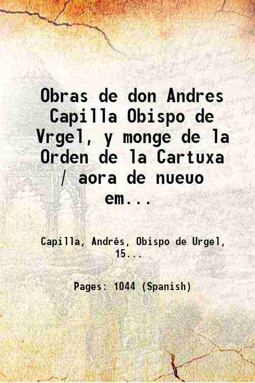 Obras de don Andres Capilla Obispo de Vrgel, y monge de la Orden de la Cartuxa / aora de nueuo emendadas y aÒadidas por el mismo autor . 1592