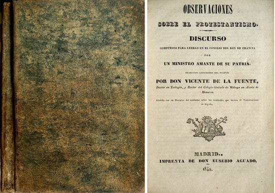 Observaciones sobre el Protestantismo. Discurso compuesto para leerlo en el Consejo del Rey de Francia por "Un Ministro Amante de su Patria". Traducido libremente del francés, y profusamente anotado, por Don Vicente de La Fuente. Añadido con un Discurso del Traductor sobre los resultados que tuviera el Protestantismo en España.