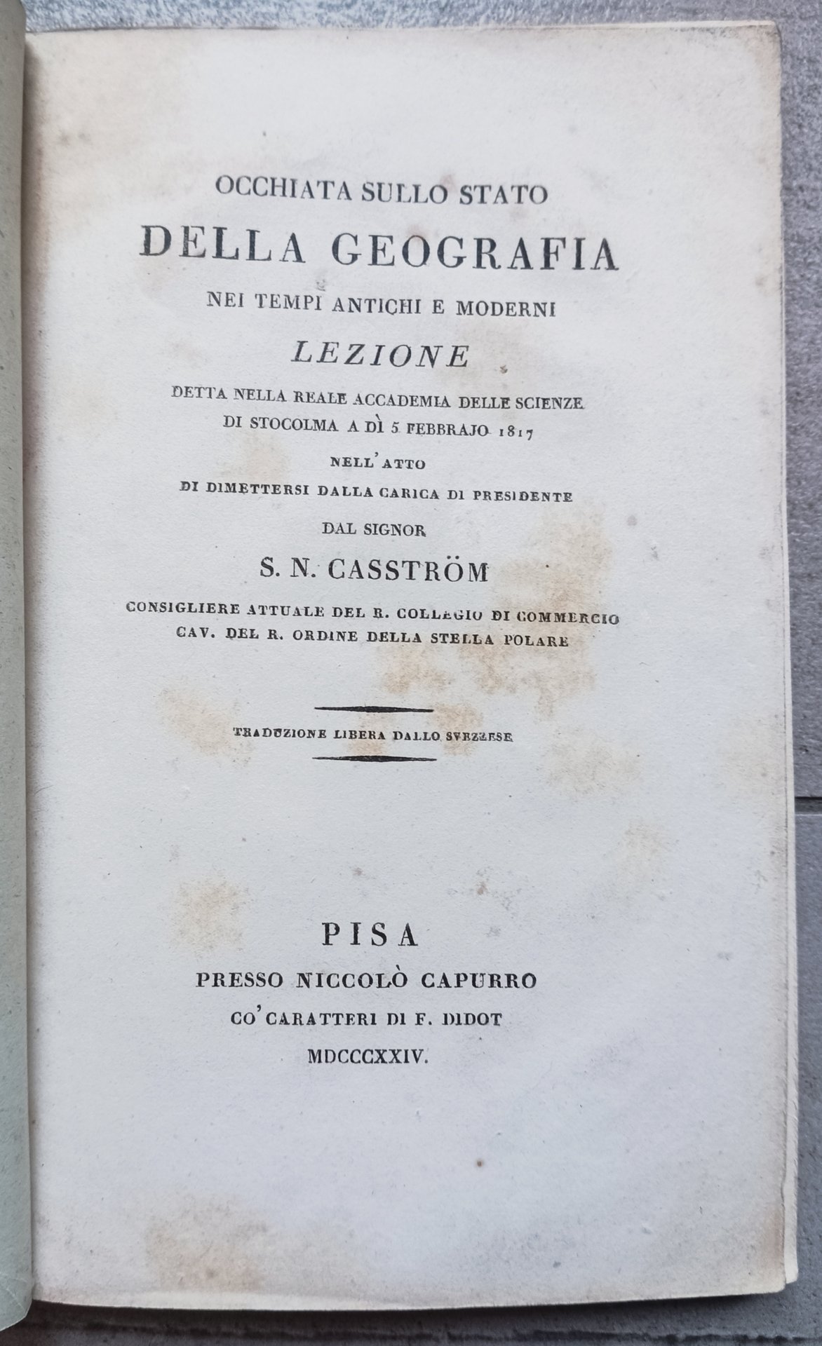 >in-8 (mm 202x128), pp. 91, brossura editoriale muta mamrorizzata blu, rosso e giallo. "Lezione detta nella Reale Accademiadelle Scienze di Stoccolma a dì 5 febbraio 1817 nell'atto di dimettersi dalla carica di Presidente dal Signor S.N. Casstrom Consigliere del R. Commercio Cav. del R. Ordine della Stella Polare". Al titolo segue dedica dell'autore. Qualche macchia rossa di umido.