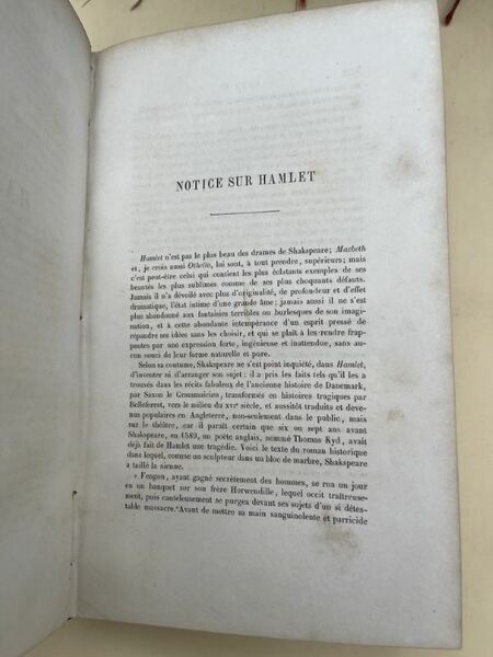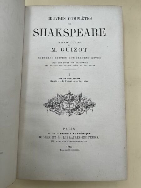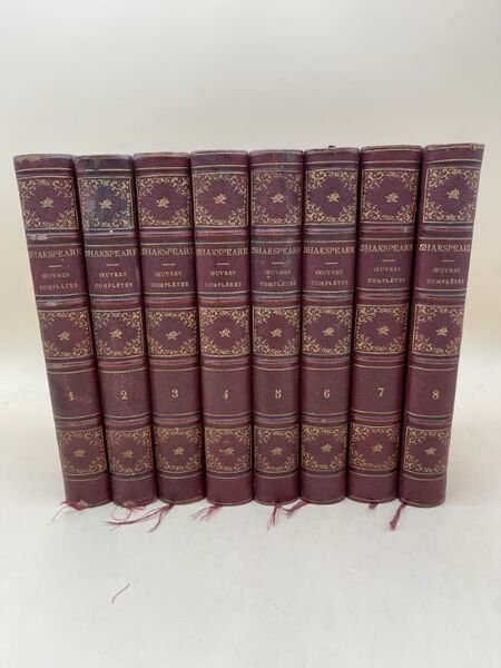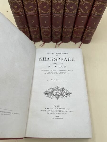 Didier 1860 Paris Didier 1860 - 1862. 8 volumes In-8 reliés demi-chagrin rouge, dos à nerfs soulignés de filets dorés, fleurons et caissons dorés. Chaque volume environ 500 pages. Traduction de M. GUIZOT. Nouvelle édition entiérement revue avec une étude sur SHAKSPEARE, des notices sur chaque piéce et des notes. Trés bon ensemble, bien complet, bien relié.