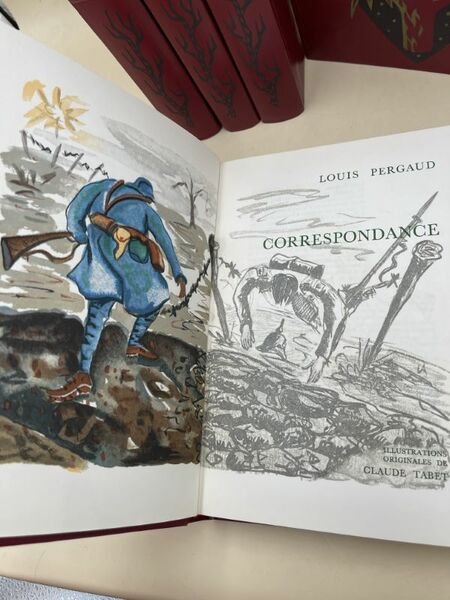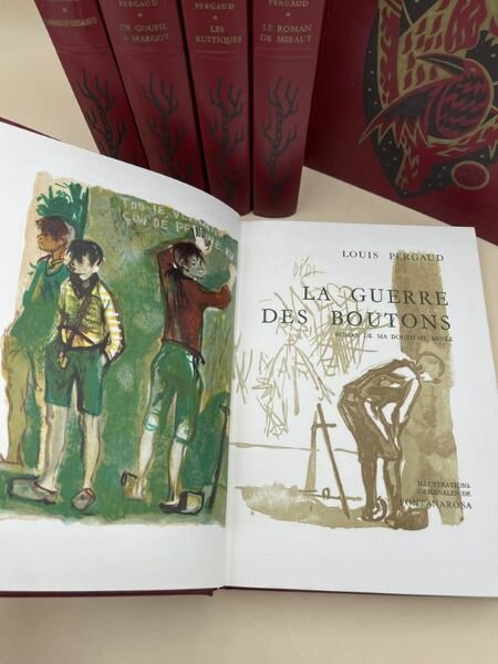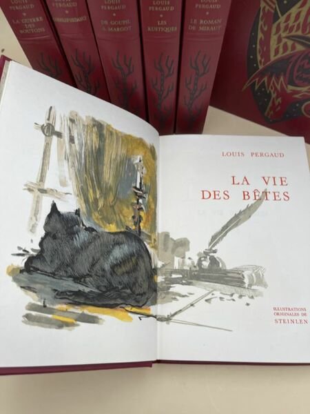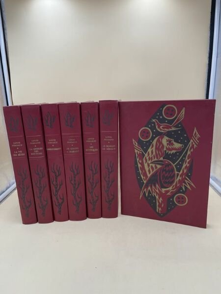 Editions Martinsart 1965 Editions Martinsart, 1965. 7 volumes In-4 reliure éditeur bordeaux à plats décorés (profil de chien dans un encadrement par Jean PICART LE DOUX), reliure du Maître relieur PRACHE. Chaque volume environ 250 pages et 77 pages pour le supplément regroupant des textes sur Louis PERGAUD de Henri FAURE, Pierre DESVALOIS, Emile PRADEL, Roger DENUX, André LOYEN + illustrations. 1: Le Roman de Miraut, chien de chasse illustrations originales de Gaston Barret (267 pages. Volume 2: La Vie des bêtes - Lebrac bûcheron - Le Miracle de Saint-Hubert - Léon Deubel - La Fontaine et la psychologie des bêtes - Choix de poèmes, illustrations originales de Steinlein (222 pages). Volume 3: La Guerre des boutons, illustrations originales de Fontanarosa (250 pages). Volume 4: De Goupil à Margot - La Revanche du corbeau - Dernières histoires de bêtes, illustrations originales de Michel No (289 pages). Volume 5: Les Rustiques - Les Petits gars des champs - Nouvelles villageoises posthumes - Ebauches, illustrations originales de Decaris (239 pages). Volume 6: Correspondance - Correspondance de guerre, illustrations originales de Claude Tabet (246 pages). Volume 7 : Plaquette de l'Edition du Cinquantenaire, avec des photographies en noir et blanc et illustrations hors-texte (77 pages). Exemplaire numéroté. Ensemble en très bel état. Exemplaire numéroté sur Vélin pur fil de Hollande Van Gelder Zonen. Bel ensemble en très bon état, bien complet en 7 volumes.