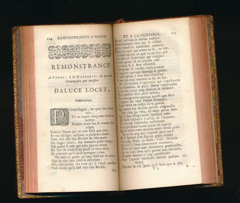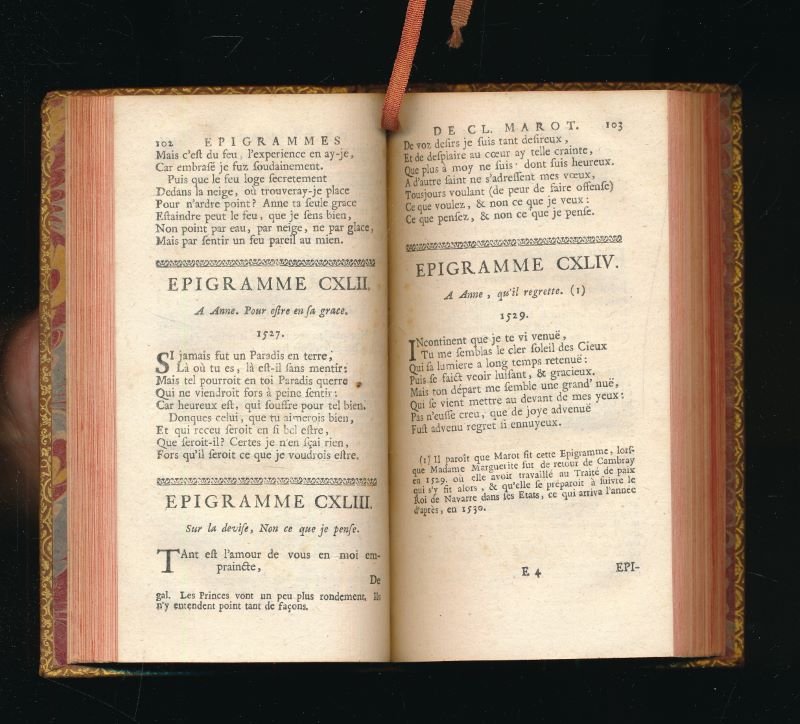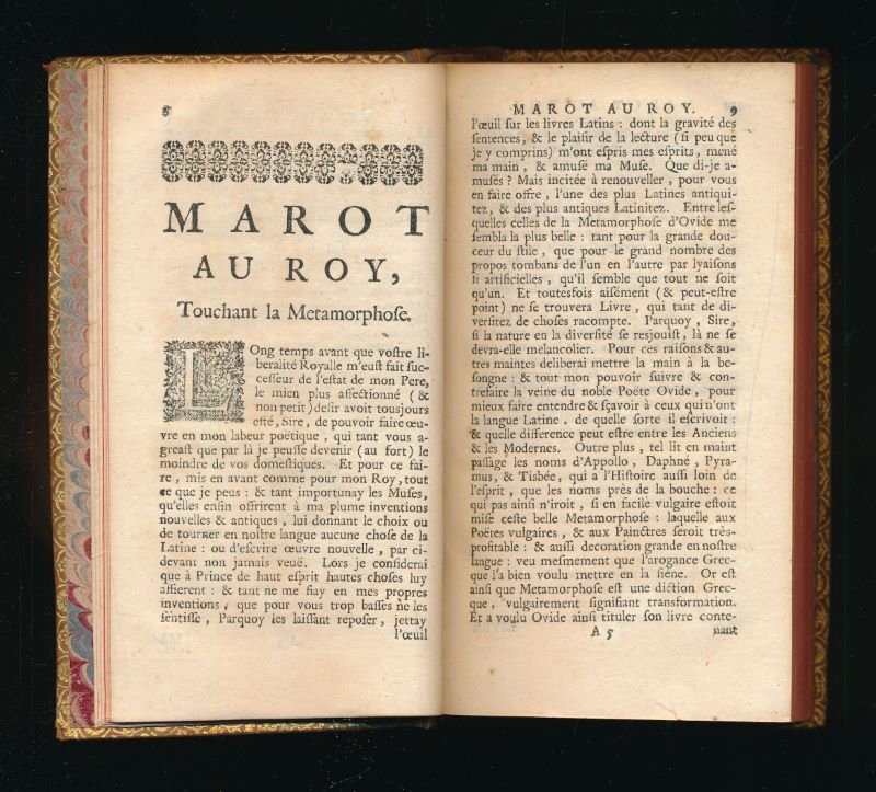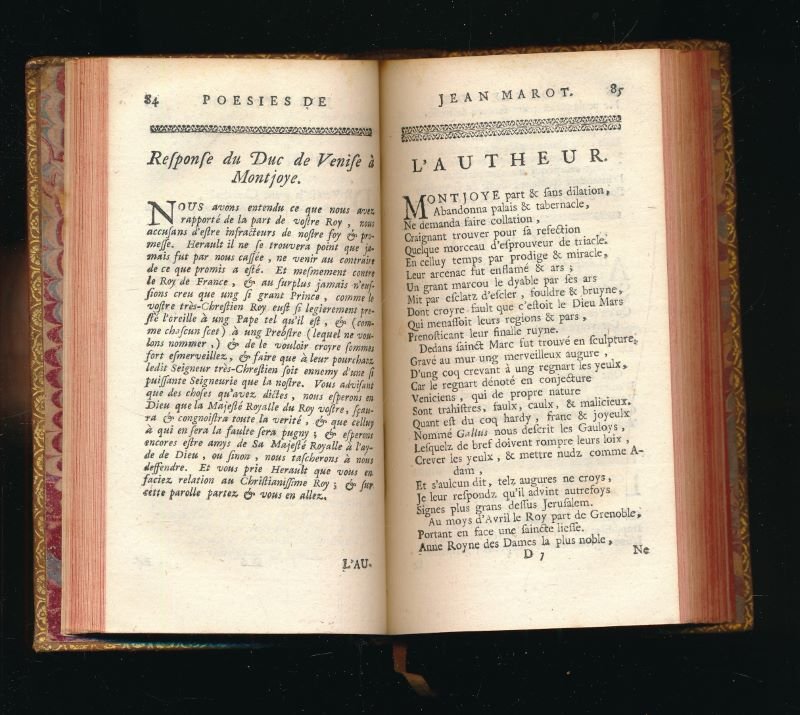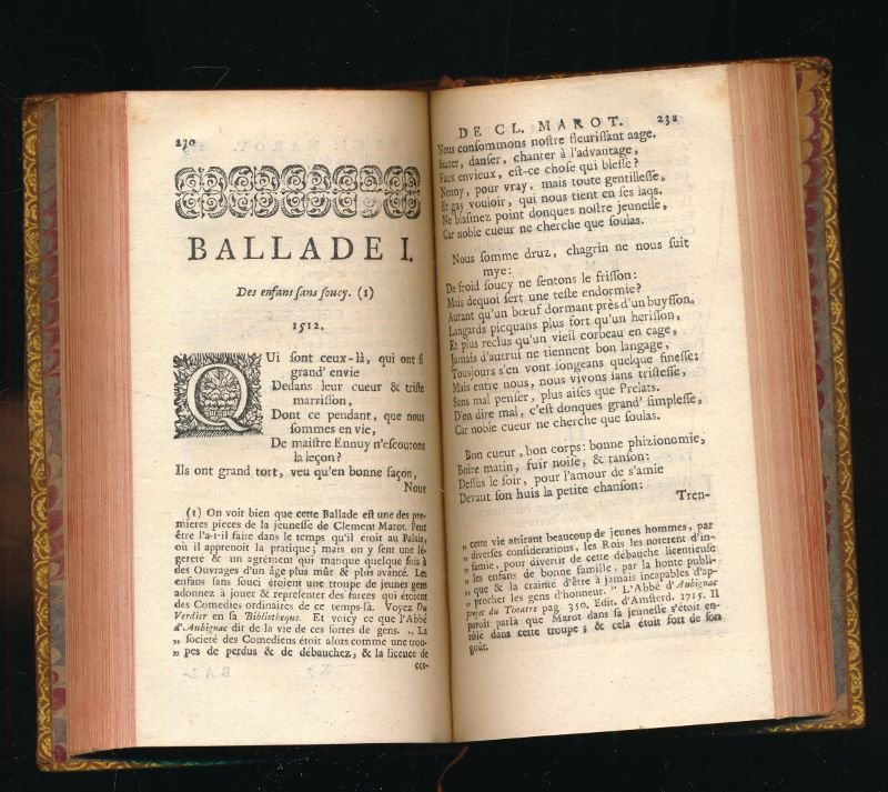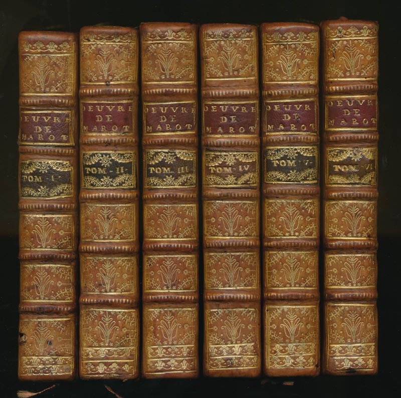 P Gosse & J Neaulme 1731 A La Haye, chez P Gosse & J Neaulme 1731. 6 volumes in-12 reliés plein veau blond de l'époque. Dos à nerfs très ornés à motifs dorés. Pièces de titre de maroquin rouge, pièces de tomaison de maroquin vert. Tranches rouges. Roulettes sur les coupes. 2 feuillets blancs, titre, XXIV, 3 feuillets non chiffrés, 1 feuillet blanc, 406 pages, un feuillet non chiffré, 2 feuillets blancs, 428, 389, 387, 392, 368 pages. Sous-titre : Valet de chambre de François I Roy de France, Revues sur plusieurs manuscrits, et sur plus de quarante éditions ; et augmentées tant de diverses poésies véritables, que de celles qu'on lui a faussement attribuées : avec les ouvrages de Jean Marot son père, ceux de Michel Marot son fils, & les pièces du différent de Clément avec François Sagon : Accompagnées d'une préface historique & d'observations critiques (établis par Lenglet-Dufresnoy). Petit trou au bas du dos du tome un, sinon très bel exemplaire tant pour la reliure que l'intérieur.