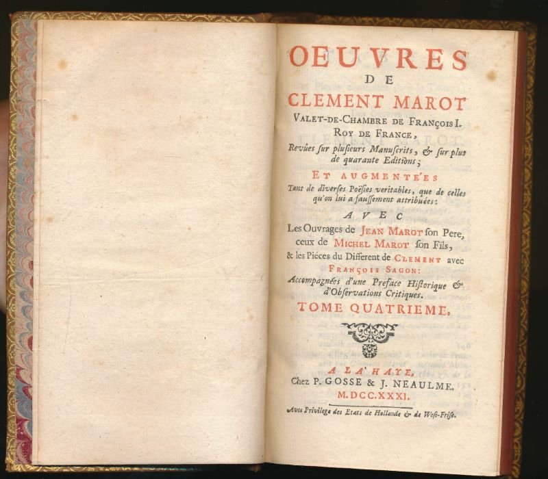 Oeuvres de Clément Marot Valet-de-Chambre de François I. Roy de France, Revûes sur plusieurs Manuscrits, & sur plus de quarante Editions, et augmentées Tant de diverses Poësies véritables, que de celles qu'on lui a faussement attribuées, avec Les Ouvrages de JEAN MAROT son Pere, ceux de MICHEL MAROT son Fils, & les Pièces du Différent de Clement avec François SAGON. Accompagnées d'une Préface Historique & d'Observations Critiques