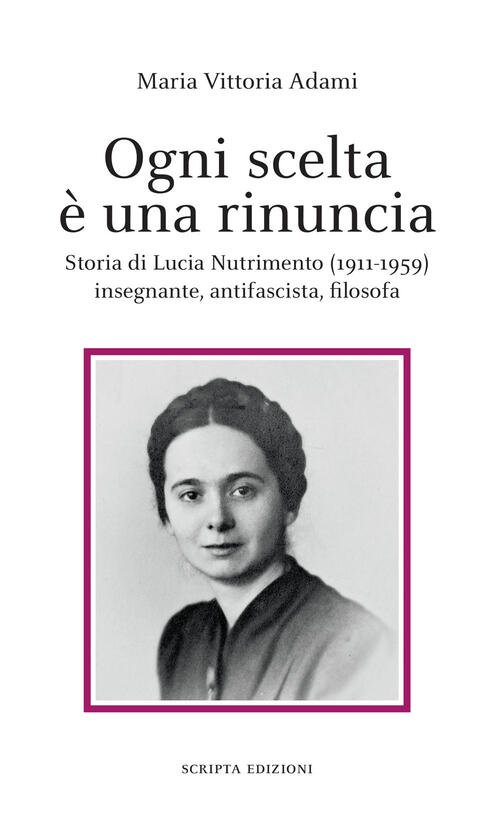 Dettagli Libro<br><br>Sku: PZZLB69282<br>ISBN: 9791280581709<br>Titolo: Ogni Scelta E Una Rinuncia. Storia Di Lucia Nutrimento (1911-1959) Insegnante, Antifascista, Filosof<br>Autore: Maria Vittoria Adami<br>Editore: Scripta<br>Anno: 2023<br>Pagine: 178<br>Formato: Brossura<br><br>Lucia Nutrimento (1911-1959), figura intellettuale veronese dimenticata, è cristallizzata in queste pagine che hanno l’ambizione di raccontare di uno spirito leggero, dall’anima pura e dagli occhi scuri ed espressivi, indagatori su tutto ciò che metteva a disposizione il mondo. Rigorosa studiosa di filosofia, silente e appassionata figura dell’antifascismo veronese, risoluto collegamento tra il Comitato di Liberazione Nazionale Veneto di Egidio Meneghetti e quello veronese, amica di Norberto Bobbio e Ferruccio Parri, staffetta di Gianfranco De Bosio, insegnante di filosofia e storia all’Istituto magistrale di Verona e al Liceo classico Scipione Maffei, tra i soci fondatori del Circolo filosofico Giuseppe Zamboni, autrice di due volumi di filosofia e di una miriade di saggi, nonché curatrice di libri per le scuole. Se non fosse stata interrotta da una grave malattia che ne ha reciso l’esistenza a soli 48 anni, la sua attività filosofica e scientifica non si sarebbe fermata. Lucia Nutrimento ha lasciato un segno peculiare di fermezza e stoicismo, di ingegno e dedizione e rappresenta un capitolo di storia culturale di Verona.