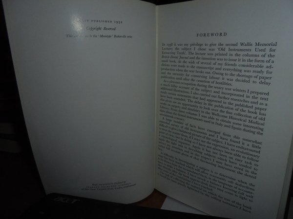 Sir FRANK COLYER. London/New York, Staples Press, 1952. OLD INSTRUMENTS used for EXTRACTING TEETH. Prima edizione. In-8° piccolo, tela edit. con titolo in oro al dorso e fregio sul piano anteriore. 245 pp. con numerose illustrazioni nel testo. Ottimo esemplare. Uff. C - IV - 4 - 2
