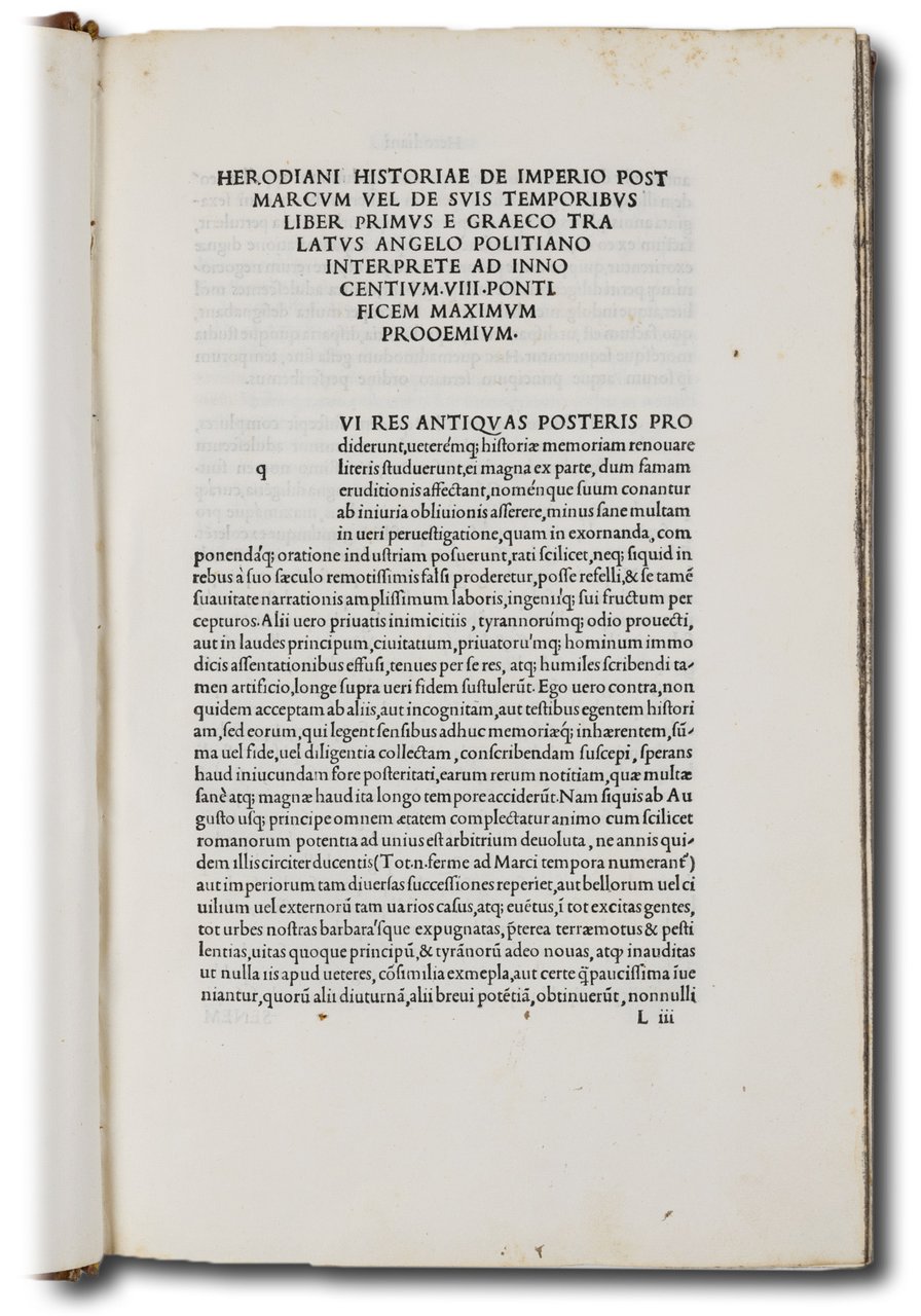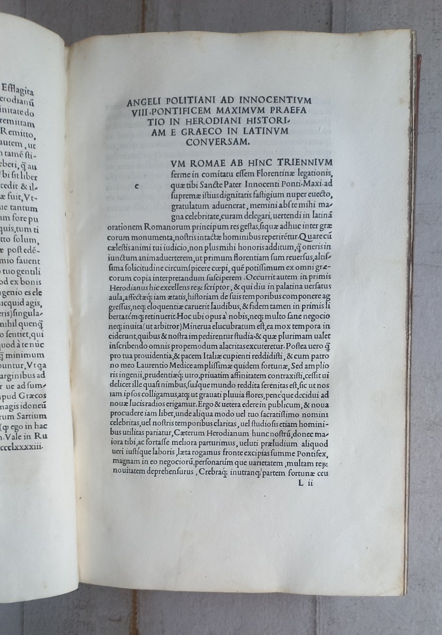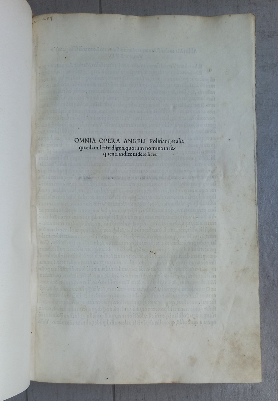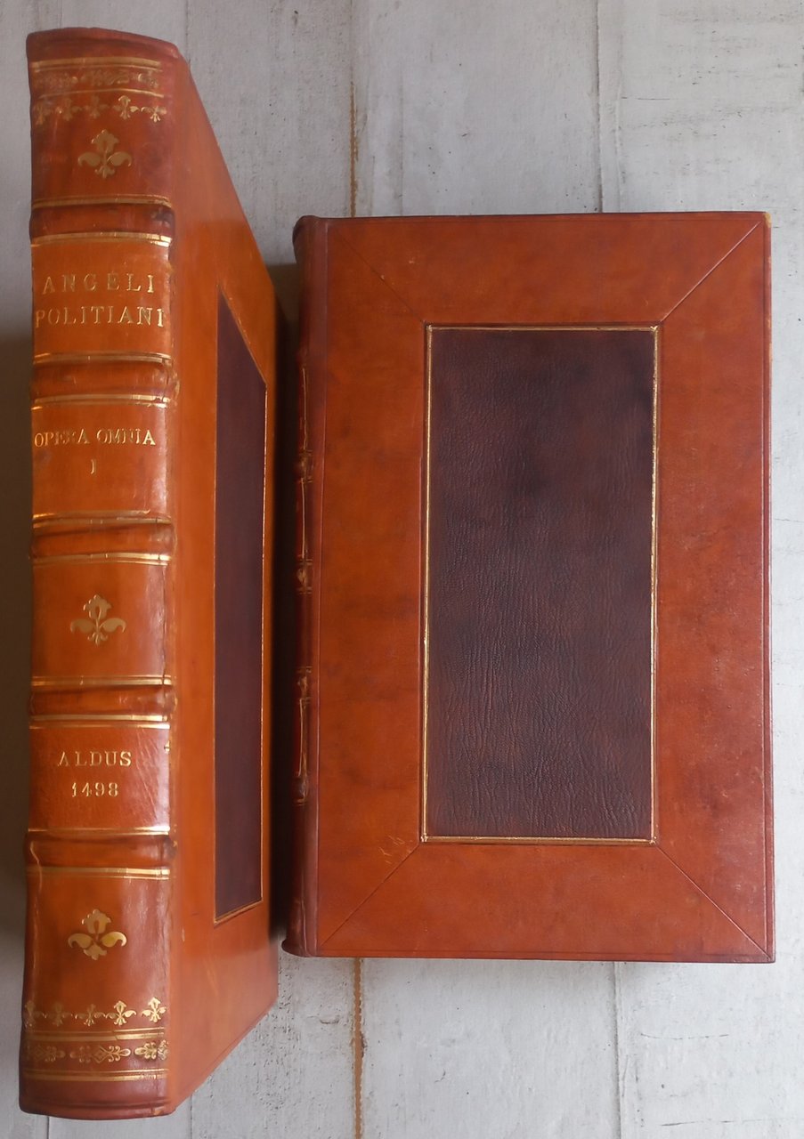 >2 volumi in-folio (mm.320x204), ff. 451 non num. (manca K4 bianco), impresso in carattere. romano, con passaggi in greco ed ebraico (carattere usato da Aldo per la primissima volta). Legatura ottocentesca in pieno vitello biondo con grande pannello centrale in marocchino più scuro, i due dorsi in sei compartimenti, dei quali due con fregi floreali in oro, gli altri quattro con tasselli che riportano autore, titolo, note tipografiche; in eleganti astucci mezza pelle e tela. F.1 : «Omnia Opera Angeli Politiani, et alia quaedam lectu digna, quorum nomina in sequenti indice videre licet» . F.450 v.: "Venetiis in aedibus Aldi Romani mense Iulio M.IID". Editio princeps delle opere latine del grande umanista e filologo toscano, curata dal bolognese Alessandro Sarti e dallo stesso Aldo Manuzio, forse il primo tentativo di edizione collettiva di un autore contemporaneo (il Poliziano era morto da soli 4 anni). Il grande umanista fu precettore dei figli di Lorenzo de Medici e molto ammirato da Aldo per le sue competenze filologiche. Alla sua morte stava preparando un'edizione delle sue lettere; il progetto fu poi ripreso dall'umanista bolognese Alessandro Sarti. Un'edizione, di cui sopravvive un solo foglio, fu intrapresa da Plato de Benedictus a Bologna, che nel 1494 aveva stampato diverse singole opere di Poliziano e una raccolta di scritti in volgare, ma il progetto fu interrotto dalla morte di Plato nell'agosto del 1496. Alle opere e alle traduzioni già pubblicate di Poliziano, Aldo aggiunse le sue lettere, le poesie latine e greche e alcuni brevi trattati. Un'edizione contraffatta fu pubblicata l'anno successivo a Brescia, come falsa stampa fiorentina.