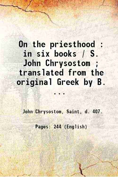 On the priesthood : in six books / S. John Chrysostom ; translated from the original Greek by B. Harris Cowper. 1866