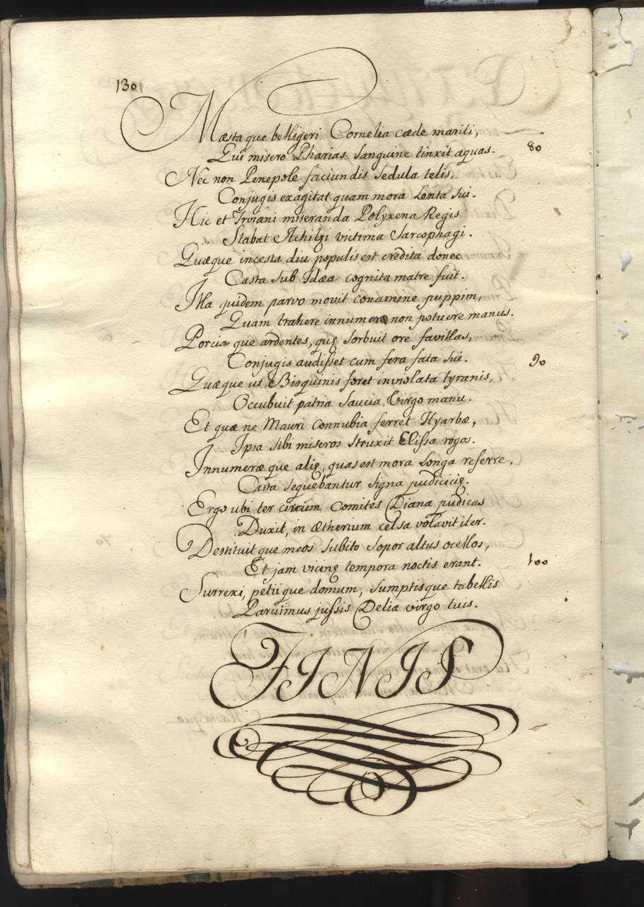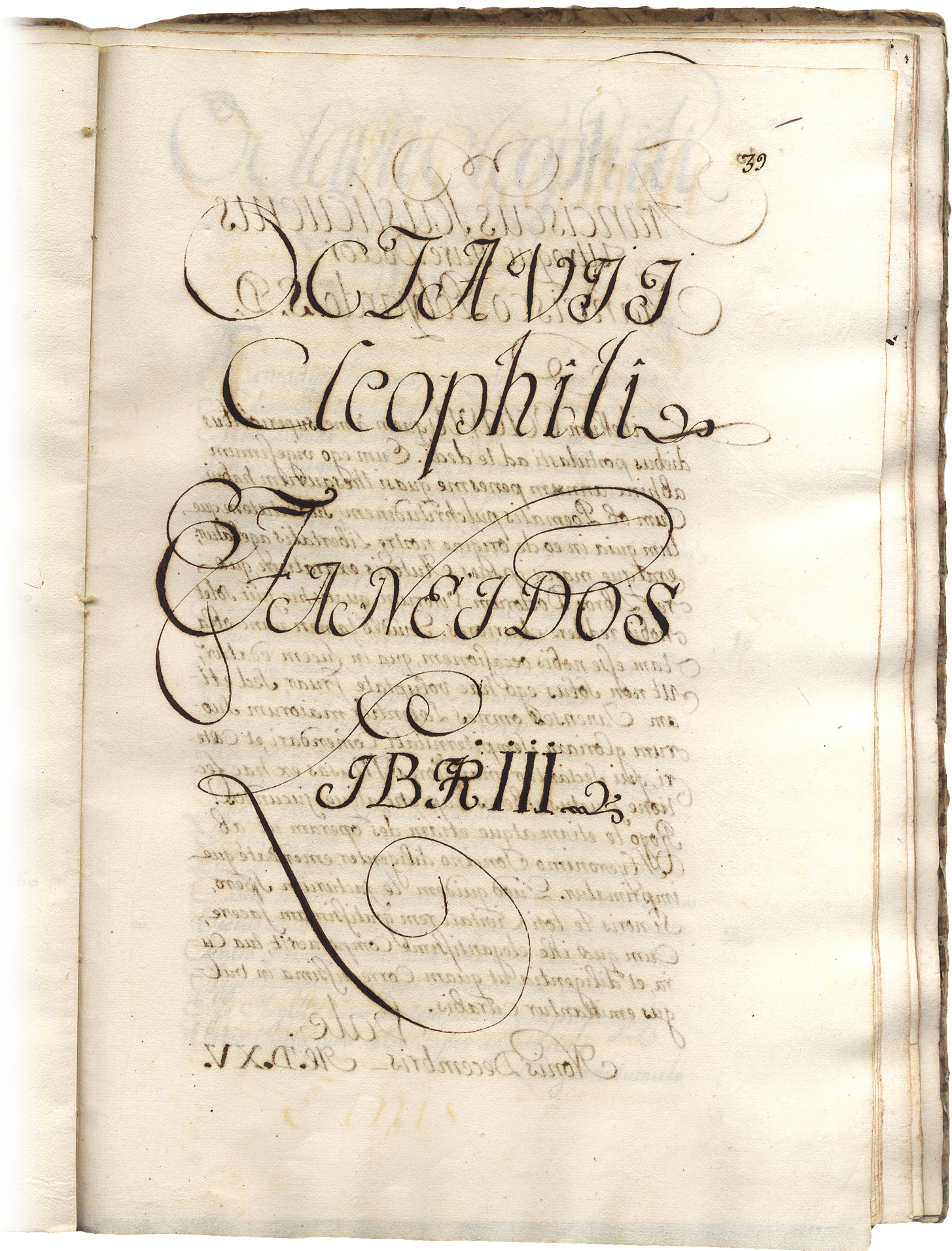 >4 opere manoscritte in 1 vol. (mm 305x210), pp. 130, (2); leg. in carta colorata (difetti alla cucitura e al dorso). Comprende quattro opere del Cleofilo, poeta nato a Fano nel 1447 e morto a Corneto o Civitavecchia nel 1490, vergate da un'unica mano in elegante corsiva, i frontespizi presentano eleganti svolazzi calligrafici: I) pp. 1-38 "Opera numquam alias impressa. Anthropotheomachia. Historia de bello Fanensi. Et quaedam alia". Opera edita per la prima volta a Fano presso il Soncino nel 1516; precedono il testo una lettera di dedica dell'opera datata 1515 al Padre generale dell'ordine di S. Agostino Egidio viterbense e una vita di Ottavio Cleofilo scritta da Francesco Polyardo. II) pp. 39-112 "Faneidos Libri III" poema eroico sulle origini della città di Fano, pubblicata anch'essa nell'edizione del Soncino: precede il testo una interessante lettera di Franciscus Rusticucius a Francesco Polyardus, al quale viene mandato il testo e chiesto di intercedere per la stampa dell'opera presso il Soncino. III) pp. 113-126 "Stinchae", di cui è nota un'edizione a stampa quattrocentesca (Roma, Eucharius Silber, intorno 1483-85). Precede l'opera un Carmen del Cleofilo "Ad Beatam Virginem". IV) pp. 127-130 "Pudicitiae Triumphus in Camillae Laudem", non riscontrato nei principali repertori. Interessante raccolta manocritta di opere edite ed inedite di Cleofilo. I-II) Prima edizione a stampa Soncino 1516 (Adams 2171. STC 187). III) Goff C746 Bibliography. IGI 3047. BMC IV 122. GW 713. IV) non riscontrato nei principali repertori a stampa.