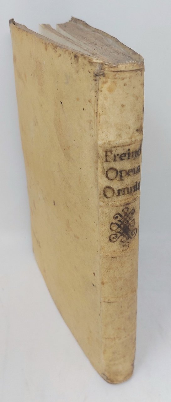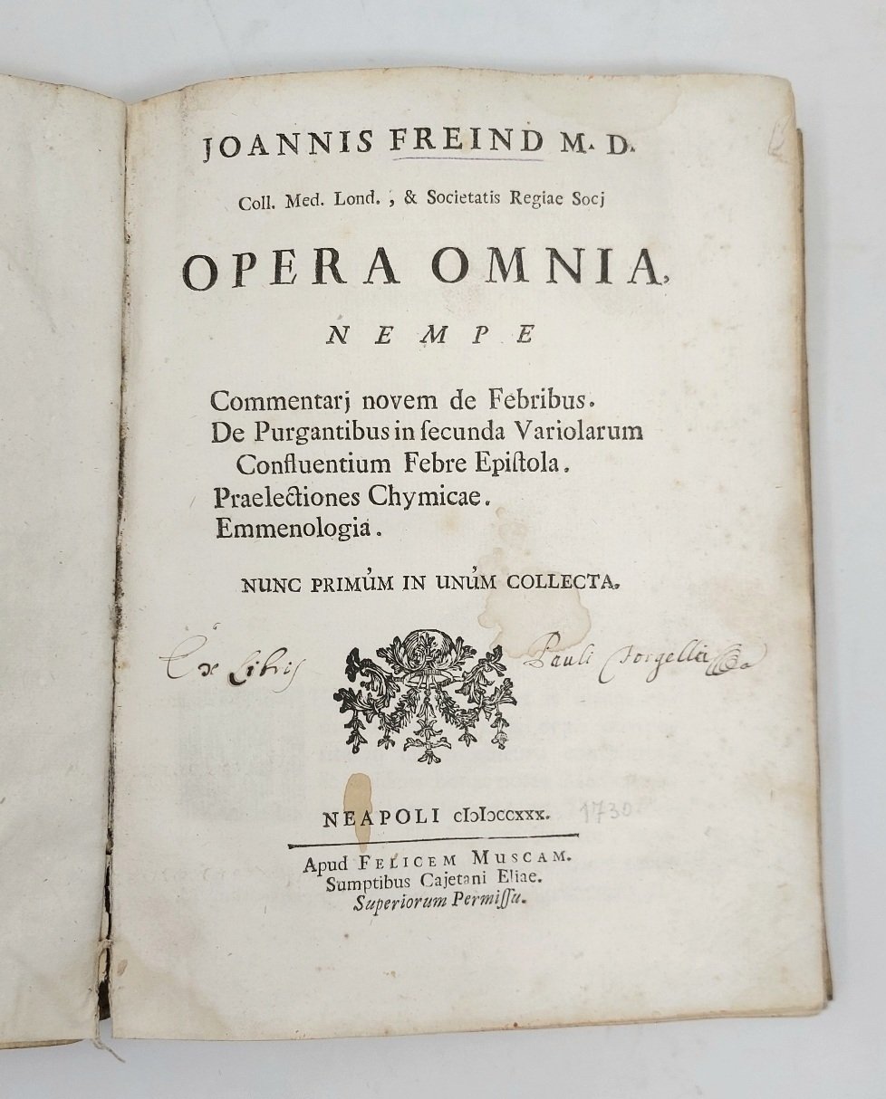 >in-8, pp. (16), 280, legatura coeva in pergamena, titolo ms. al dorso (piccolo difetto sul piatto anteriore). Fregetto al titolo; numerose iniziali e finalini ornati. Prima edizione collettiva di importante opera medica del celebre fisico inglese John Freind (1675-1728) che riunisce i trattati sulle febbri, purganti, rudimenti di chimica e sui mestrui, precedentemente pubblicati a Londra e Amsterdam tra 1703 e 1717. (Discreto esemplare , fori di tarlo nel margine bianco inferiore agli ultimi ff.; antica nota di possesso al titolo ''Ex libris Pauli Borgella''). Blake, pag. 161. Garrison Morton,6378: ''John Freind (1675-1728) was the first English historian of medicine''. Non in Wellcome, che cita solo la seconda edizione londinese del 1733.