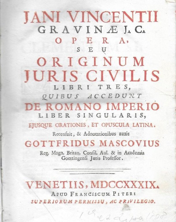 Opera seu originum Juris Civilis, libri tres quibus accedunt de Romano Imperio, liber singularis, ejusque orationes, et opuscola latina. Recensuit, & Adnotationibus auxit Gottfridus Mascovius.