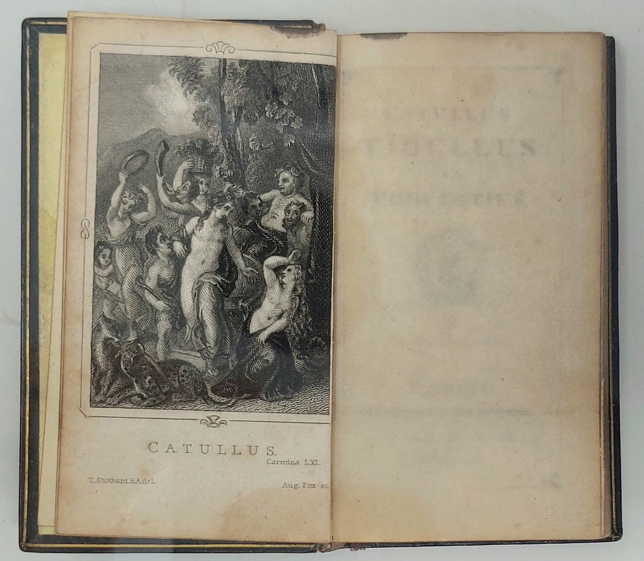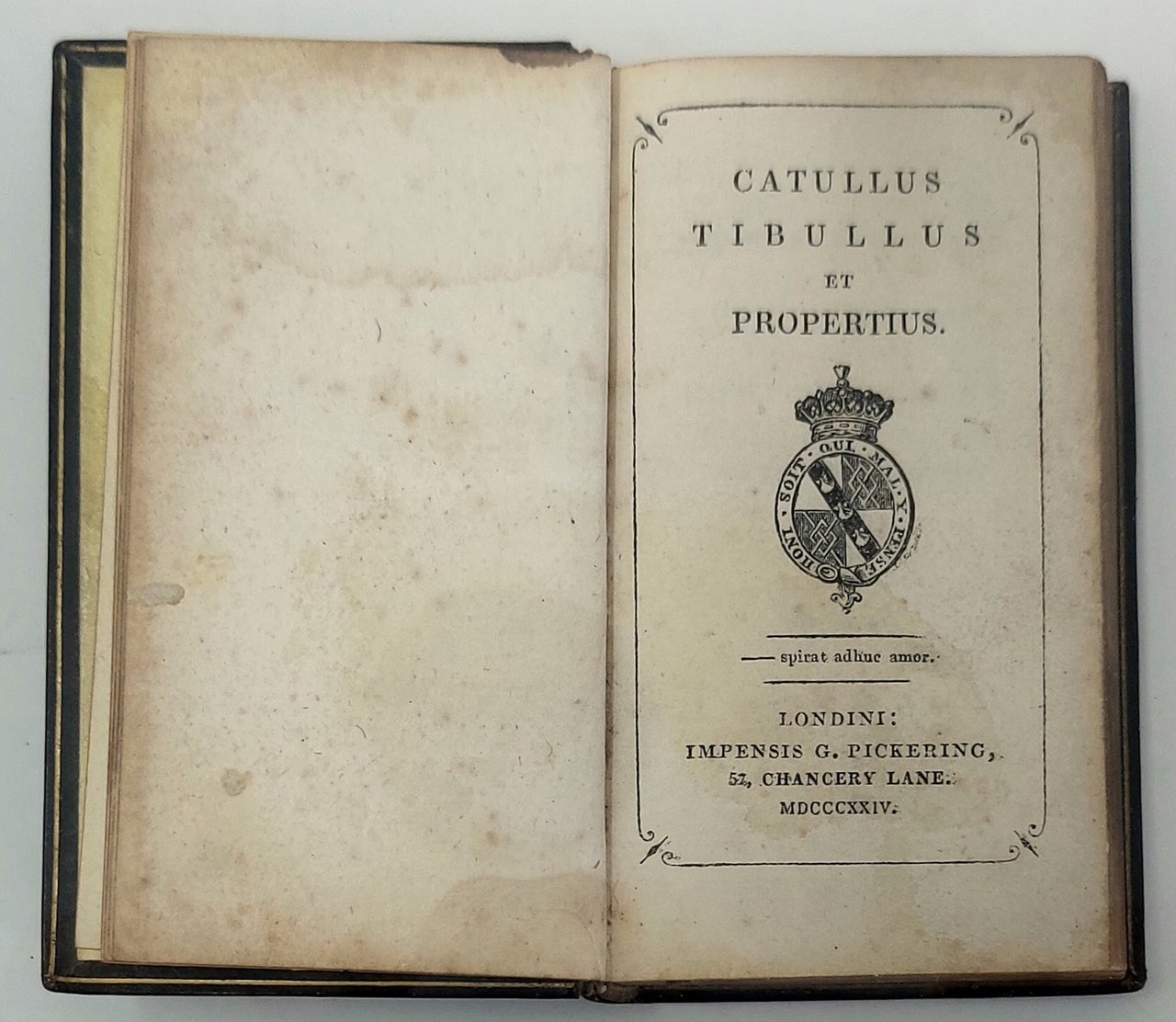 >in-36 (mm 84x45), pp. 61, (1), 46, 93, (1), bella legatura dell'epoca in marocchino nero, "Catullus" in oro al dorso a nervi. Minuscola edizione facente parte della Miniature classics, una collezione che l'editore e letterato londinese Guglielmo Pickering (1796-1854) dedicò al conte Spencer. L'opera riscosse un grande successo all'epoca della sua pubblicazione per la deliziosa cura nella realizzazione tipografica: per la sua impressione venne infatti utilizzato il cosiddetto diamond type, un carattere tanto minuto da meritare l'appellativo di diamante. Ottimo esemplare.
