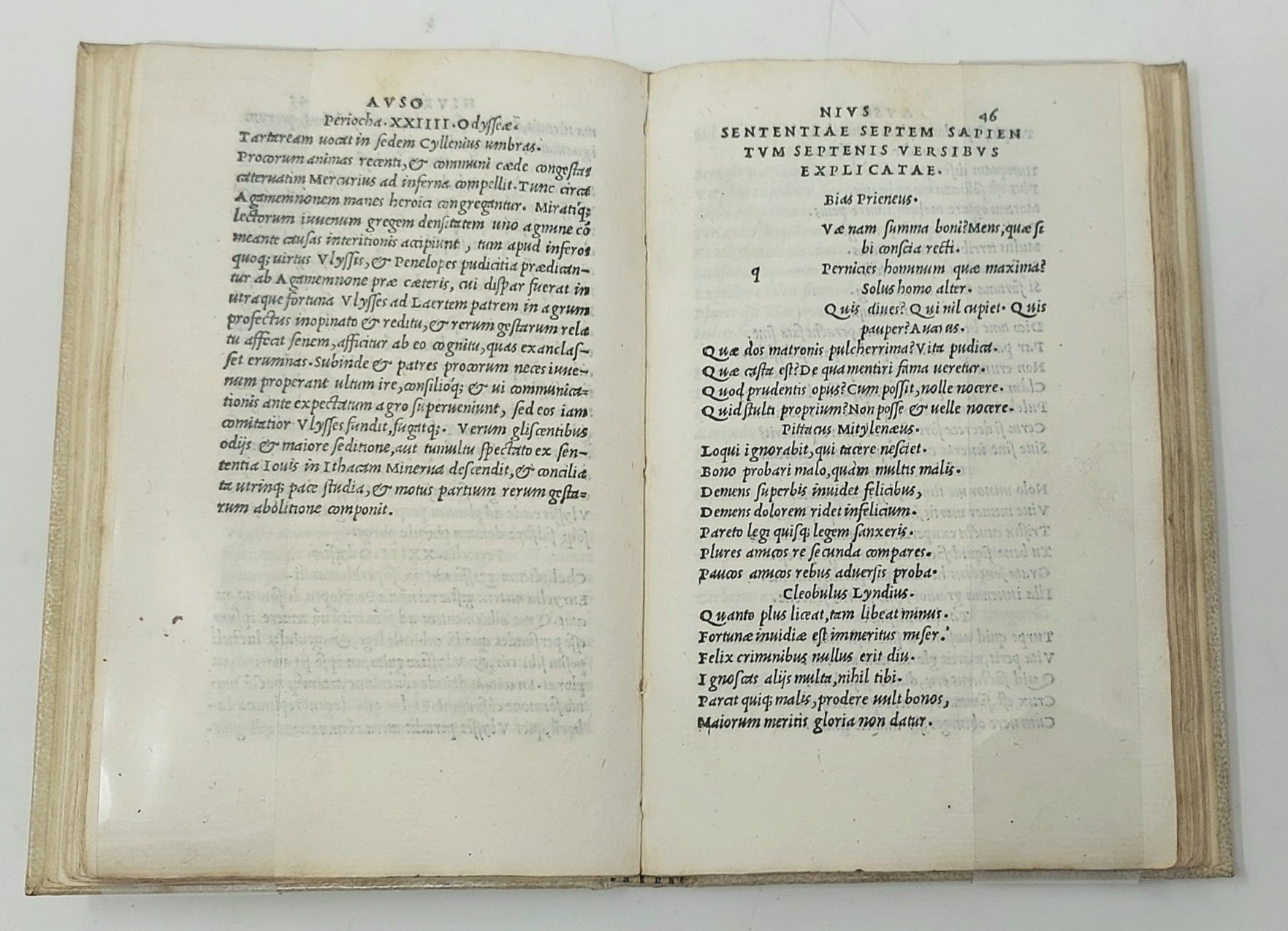 >in-8 (155x98 mm), ff. 107, (1), legatura settecentesca piena pergamena rigida, titolo manoscritto al dorso. Testo in carattere corsivo, spazi con lettera-guida per le iniziali, àncora aldina sul titolo ed al verso dell'ultimo foglio. Prima ed unica edizione aldina delle opere di Ausonio, curata da Girolamo Avanzo che la dedica al card. Marco Cornelio. Tra le altre opere (Epigrammi, Epistole poetiche, Commento alle sentenze dei sette Sapienti, ecc.) è particolarmente interessante e famoso il poemetto ''Mosella'', che tramanda il resoconto di un viaggio da Treviri a Bingen, ricco di particolari curiosi sulla vita, gli usi ed i costumi degli abitanti di quella regione. Ausonio fu poeta latino del IV secolo (nato a Bordeaux verso il 309 e morto intorno al 394), maestro dell'imperatore Graziano e da lui eletto console nel 379. Bell'esemplare. Firma cancellata sul primo foglio, forellino di tarlo nel margine alto dei primi due fogli. Renouard 80.7. UCLA 137. Adams A-2278.