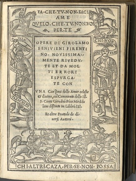 >in-8, ff. 208 (benché num 302 con la numerazione 171-76 ripetuta su y3-8 e z1-z5; e le tre carte finali num. 300, 261 e 302), legatura posteriore in pergamena rigida, titolo manoscritto al dorso. Titolo in cornice xilografica figurata con scene di cavalieri, di torneo, motto “Fa che tu non faci a me quelo che tu non voi per Te” - “Chi altri caza per se non possa” (in basso). Rara seconda edizione (la prima, Giunta, 1519). “Stimata edizione con le Frottole dei diversi Autori stampate per la prima volta” (C.A.Chiesa, Libri italiani rari del Rinascimento, n.19). Nella dedicatoria si sottolinea come l'opera, malamente stampata a Firenze "non altrimenti che rutilante gemma in sterco giaceva", sicché il curatore tal Cassiodoro Ticinensis l'aveva "con accurata vigilanza alla primiera nitidezza ridotta, non posponendo l'osservazione delle regole del volgar più terso idioma". Il modello di amore ficiniano aveva influenzato anche il grande principe-erudito Pico, che fu amato ardentemente dal Benivieni. A lui Pico dedicò il suo unico scritto in volgare e il Benivieni permise allo Zopino di aggiungere la Canzona d'amore, con una premessa che spiegava gli scrupoli religiosi che l'avevano indotto a ritardarne la pubblicazìone. “Seguace del Ficino, compose un poemetto allegorico latinizzante intitolato "Amore" ed espose la teoria dell'amor divino del maestro in una canzone cui Pico della Mirandola appose un ampio commento. Divenuto fervente seguace del Savonarola, ripudiò il passato, volse a significato religioso le sue poesie d'amore platonico-petrarchesche...” (Treccani, II, p. 203). L'edizione riunisce dunque tutte le rime che il B. ritenne degne di esser pubblicate e consone al suo atteggiamento spirituale. Segue la nuova edizione della Bucolica, quindi il "capitolo" dantesco (ai f. 111-114 Cantico in laude di Dante Alaghieri), varie deploratorie e consolatorie, poesie in lode di Lorenzo e in morte di Simonetta Cattaneo, altre dedicate al Pico, saggi di traduzione dall'ebraico e dal latino, laudi e canzoni morali di schietta ispirazione savonaroliana, nonché altri brevi componimenti minori di tono scherzoso e faceto. L'elegante corsivo dello Zoppino è assai nitidamente impresso e le Frottole in settenari impaginate con raffinatezza. Magnifico esemplare, fresco e assai marginoso . Sander, I, 899; Essling 2141; Brunet, I , p. 773: “Edition peu commune, encore assez recherchée” Gamba, 1068; Adams, I, p. 112.C.A.Chiesa, Libri italiani rari del Rinascimento, n.19: "Stimata edizione con le Frottole dei diversi Autori stampate per la prima volta". De Batines, I, 65 (cita ediz. precedente per la Cantica in lode di Dante). (in nota): “L'editore Biagio Bonaccorsi scrive, che nelle stampe anteriori erano alcuni di questi componimenti imperfecti et ripieni di molti errori. Due volte si ristamparono in Venezia, Zoppino, 1522 e de' Gregorii, 1524. Sono Egloghe, Canzoni, Sonetti, Laudi spirituali, Frottole e traduzioni delle Bucoliche di Mosco, di un'Elegia di Properzio, di alcuni Salmi di David, del Dies irae",