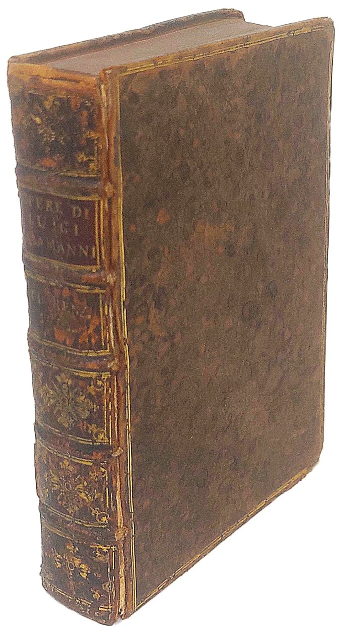 >in-8 piccolo (150x100 mm), pp. (8), 435, (11), caratt. corsivo. Legatura 600sca in piena pelle, doppio filetto oro ai piatti, dorso a nervi con fregi e titolo oro, tagli rossi (difetti alle cerniere). Ipresa dei Giunti sul titolo e al verso dell'ultimo foglio. Edizione contemporanea a quella di Lione che fu impressa in 2 volumi ed è riconosciuta come l'originale. Questo volume corrisponde alla ''Prima parte'' dell'opera e contiene 30 elegie, 14 egloghe, 178 sonetti con 5 ballate e 2 canzoni; la Favola di Narciso in ottava rima; il Diluvio romano e la Favola di Atlante; 12 satire e i sette Salmi Penitenziali in terza rima. Edizione dedicata (come anche quella di Lione) a Francesco I. Esemplare con i margini superiori rifilati, qualche lieve ingiallitura e difetti all'ultimo foglio. Gamba, 14, note. Adams, A-405. . Camerini, I, n. 225. STC, 12.