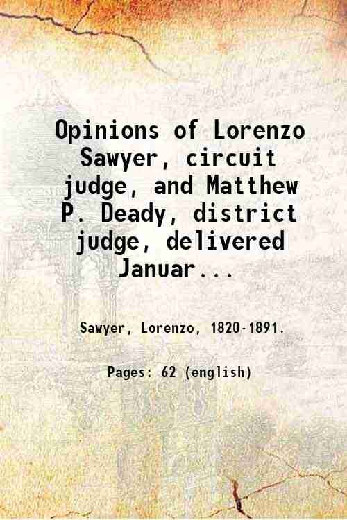 Opinions of Lorenzo Sawyer, circuit judge, and Matthew P. Deady, district judge, delivered January 7, 1884, in the case of Edwards Woodruff, complainant, vs. North Bloomfield gravel Mining Co., et al., defendants : with note and index / Geo. Cadwalader, I.S. Belcher, J.N. Pomeroy, for complainant ; Stewart and Herrin, J.K. Byrne and W.C. Belcher, for defendants. 1884