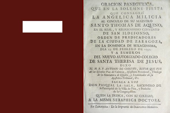 Oración Panegyrica en la solemne fiesta que consagró la Angélica Milicia al Cíngulo de Santo Thomas de Aquino en el Real Convento de San Ildephonso de Zaragoza, a esmeros del nuevo autorizado Colegio de Santa Theresa de Jesús.