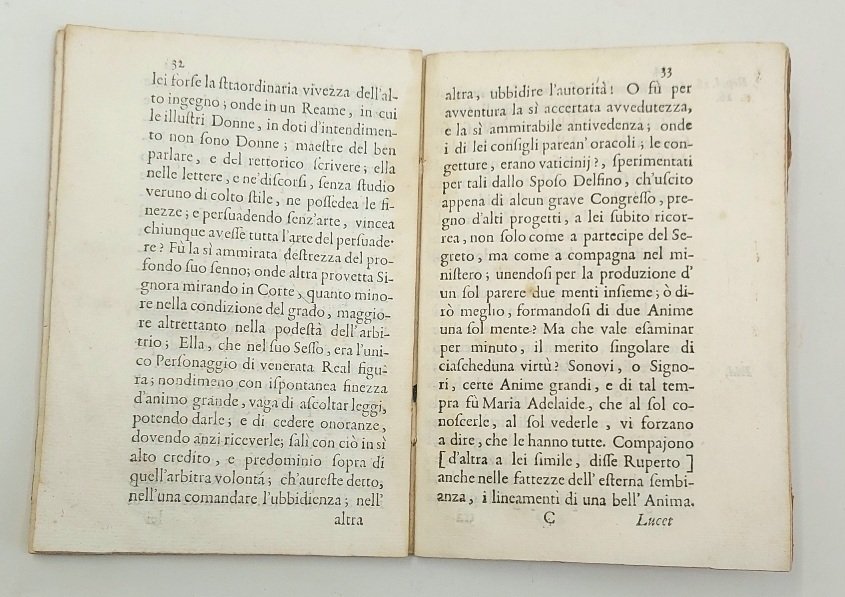 >in-16, pp. 62, (2), leg. cart. epoca. Fregi ed iniz. silogr. Maria Adelaide, figlia Vittorio Amedeo II e di Anna Maria d' Orléans, nacque a Torino nel 1685 e morì giovanissima a Versailles il 12 febbraio 1712; nel 1697 aveva sposato Luigi Borbone, duca di Borgogna, che purtroppo scenderà in armi contro Vittorio Amedeo II; il terzo dei suoi figli diventerà re Luigi XV. Raro panegirico. (qualche lieve ingiallitura).
