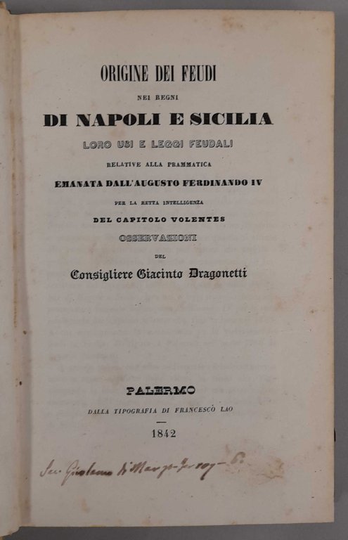Origine dei feudi nei regni di Napoli e Sicilia. Loro usi e leggi feudali relative alla prammatica emanata dall'Augusto Ferdinando IV per la retta intelligenza del Capitolo Volentes. Osservazioni del Consigliere Giacinto Dragonetti unito a Rimostranza del caporuota e consultore D. Saverio Simonetti sulla reversione dei feudi di Sicilia al Regio Fisco nel caso della mancanza dei feudatari senza legittimi successori in grado