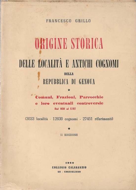 Origine storica delle località e antichi cognomi della Repubblica di Genova. Comuni, frazioni, parrocchie e loro eventuali controversie dal 958 al 1787
