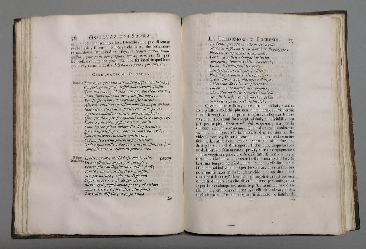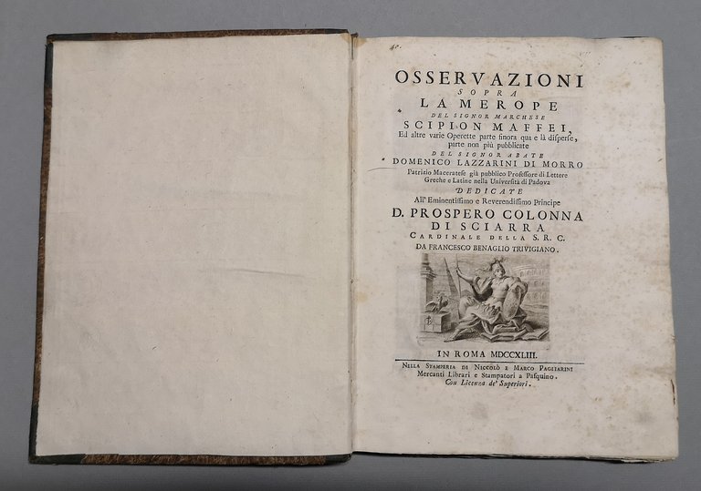 >in-4, pp. XLII, 203, leg. del tempo m. pelle e ang., tass. con tit. e fregi oro al dorso. Con vignetta al tit., tre testatine e sette iniziali incise. Prima edizione, postuma, di questi scritti del Lazzarini (Macerata 1668-1734), raccolti ed editi a cura del suo discepolo Francesco Benaglio e da questi dedicati al Principe e Cardinale Prospero Colonna di Sciarra. All'inizio delle ''Osservazioni sulla Merope'', seguite da altre ''Osservazioni sopra la traduzione di Lucrezio di Aless. Marchetti'', apparsa a Londra nel 1717, vi è una lunga nota manoscritta di anonimo, la quale ci avverte che tali scritti, pubblicati proditoriamente dal Benaglio, contengono vari errori che non è stato possibile correggere perché ''ci mancano gli originali''; numerose dotte correzioni manoscritte, invece, si trovano nel margine delle opere minori aggiunte in fine (tre orazioni latine ed alcune lettere), oltre due pagine di errata in fine al vol. Bell'esempl. a pieni margini. ,