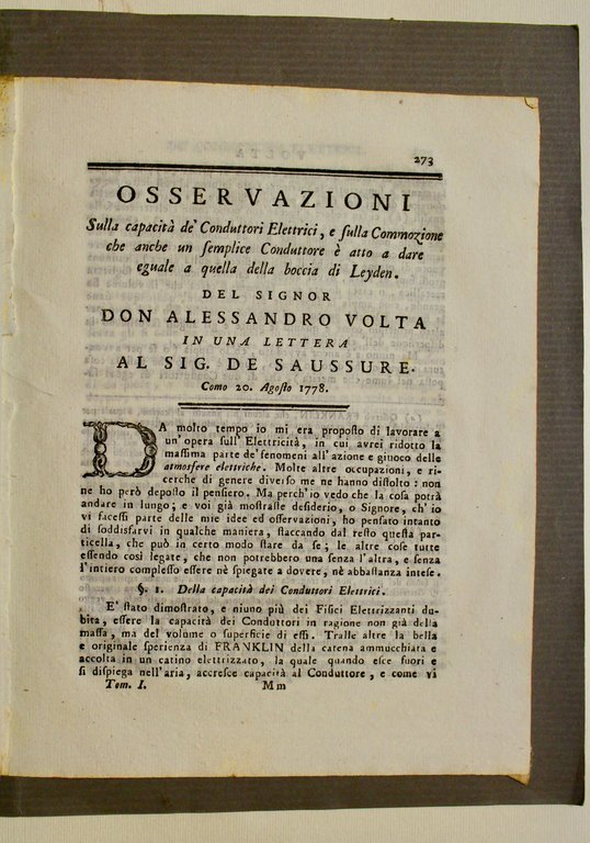 Osservazioni sulla capacità de' Conduttori elettrici, e sulla commozione che anche un semplice Conduttore è atto a dare eguale a quella della boccia di Leyden.