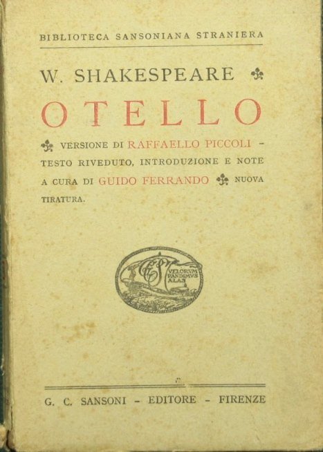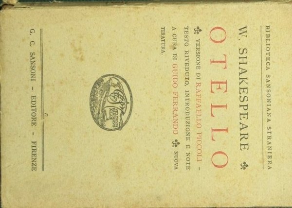 Versione di Raffaello Piccoli. Testo riveduto, introduzione e note a cura di Guido Ferrando - Collana Biblioteca sansoniana straniera. N. 74 - in 16° - pp.XLVIII + 259 - Brossura editoriale - Rare sottolineature a matita in alcune pagine - Testo a fronte in lingua inglese. Titolo all'occhiello: La tragedia di Otello, il moro di Venezia