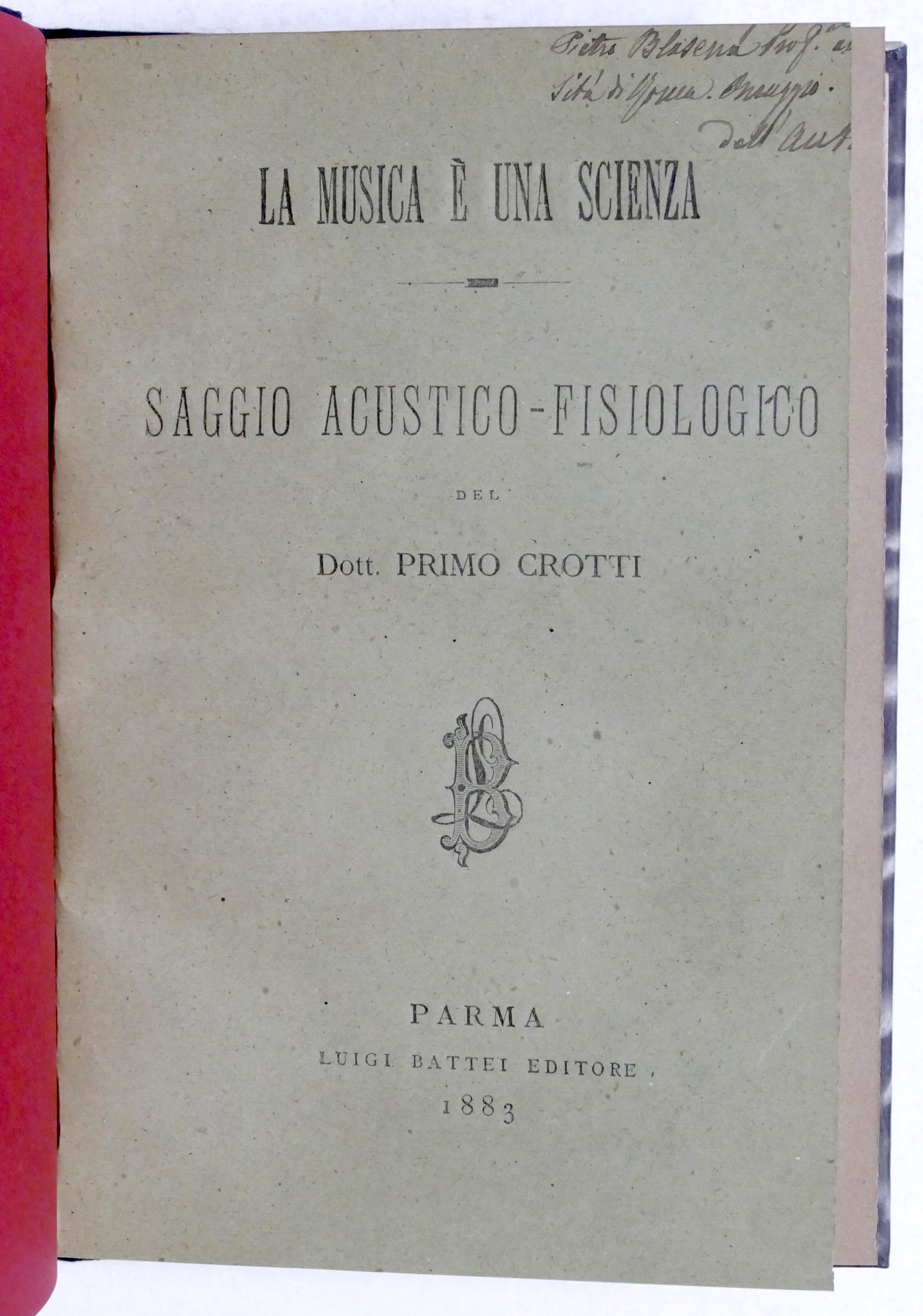 La musica è una scienza - Saggio acustico-fisiologico del Dott. Primo Crotti Parma, L. Battei, 1^ ed. 1883 Pag. 54 Copertina rigida non coeva - Testo in italiano. Condizioni molto buone. Legatura e sguardie rifatte. Copertina in brossura originale conservata. Piccoli segni di restauro da pag. 51 a pag. 54.