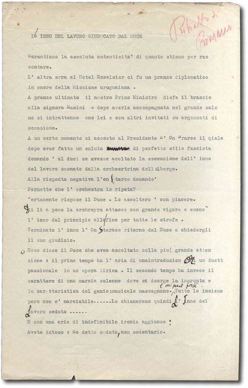 >1 pagina in-folio dattiloscritta con correzioni, non firmata in inchiostro bruno n.t. probabilmente autografe di Mussolini e annotazione a lapis rossa in alto a destra ''Ritratto di Romano''. Si tratta dell'inedito racconto della prima volta che al Duce venne fatto ascoltare il ''Canto del lavoro'' con le parole di Edmondo Rossoni e Libero Bovio e musica di Pietro Mascagni, edito per la prima volta a stampa nel 1928. Il commento di Mussolini fu che ''... il primo tempo ha l'aria di una introduzione, di un duetto passionale in un'opera lirica. Il secondo tempo ha invece il carattere di una marcia solenne... tutto lo insieme però non è marciabile...Lo chiameremo quindi l'Inno del Lavoro seduto... E con una aria di indefinibile ironia aggiunse: Avete inteso: Ho detto seduto, non sedentario.''. Il Romano fu deputato dal 1929 al 1939, sottosegretario di stato alle Comunicazioni, segretario del Partito Fascista della città di Acireale e Podestà di Noto .