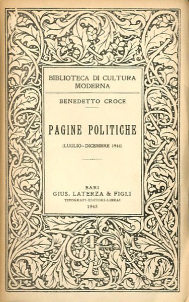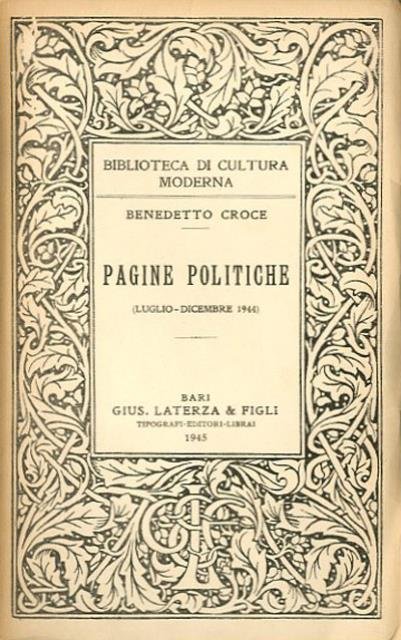 154 p. ; 20 x 13 cm. Biblioteca di cultura moderna, 392. «Queste pagine, scritte per varie occasioni nel secondo semestre del 1944, formano sèguito, qui raccolte, all'altra raccolta: Per la nuova vita d'Italia, scritti e discorsi (Napoli, Ricciardi, 1944), nella quale si dava come una delineazione dell'attività politica che si svolse nell'Italia meridionale dagli ultimi del luglio del '43 al giugno del 1944, ossia fino alla liberazione di Roma. [.] Nelle pagine qui raccolta, che sono anch'esse di articoli e discorsi, si continua a lumeggiare e a discutere gli atteggiamenti dei vari partiti e i rapporti dell'Italia con le Potenze alleate, e a considerare le forze in giuoco nel mondo odierno. Collocate in appendice si troveranno pagine di carattere polemico, attinenti alle vicende della cultura italiana durante il dominio dello sciagurato fascismo, alcune delle quali scritte in quegli stessi anni e fatte circolare dattilografate». (dalla presentazione di B. Croce). Brossura editoriale, coperta in cartoncino flessibile con titolo impresso al dorso e al piatto riquadrato in cornice con motivi floreali. Qualche leggero segno del tempo (ingiallimento della carta), per il resto esemplare in buono stato. Codice libreria 4826.