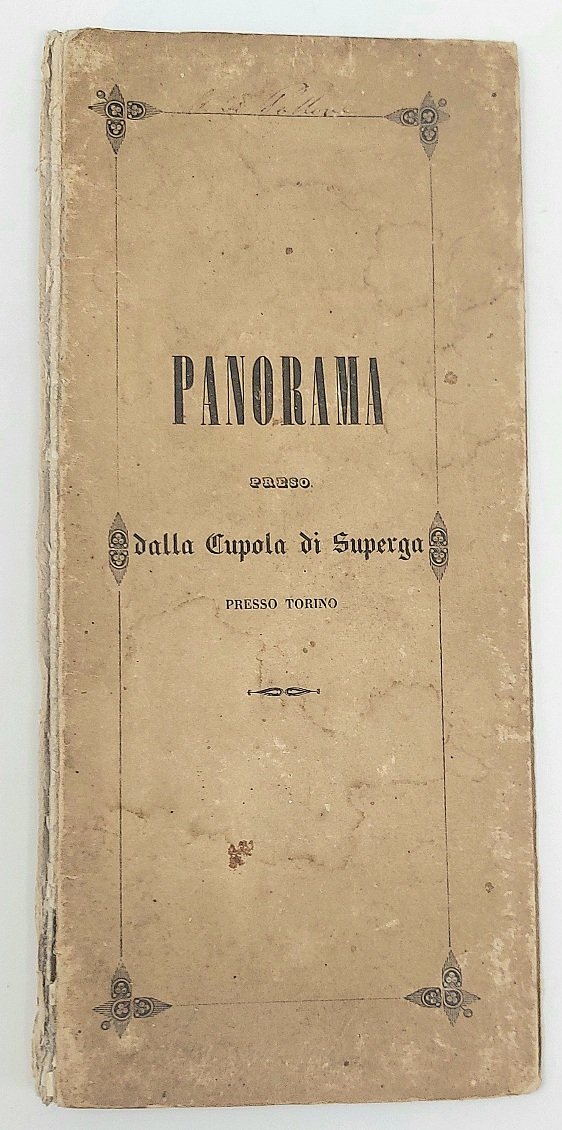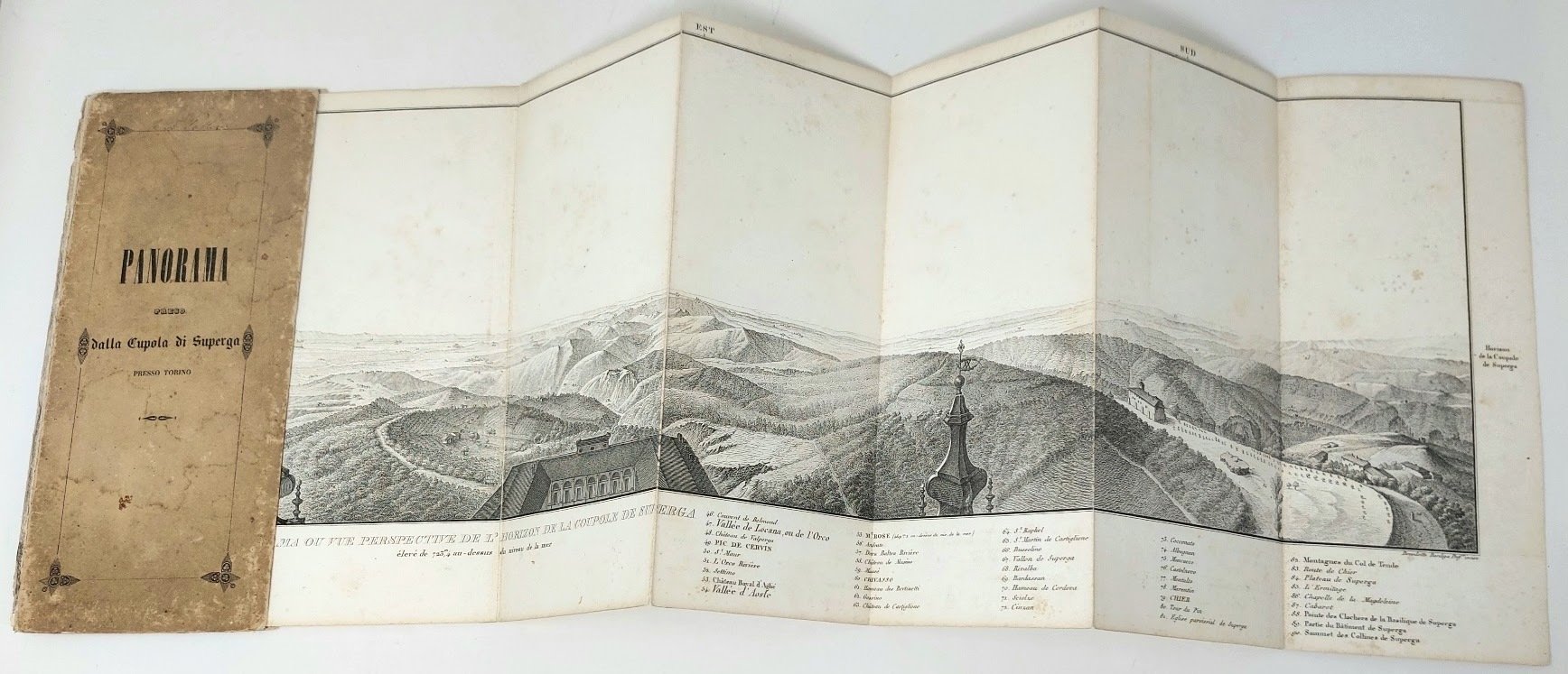 >in-8, cart. edit. con riquadro ornam. e tit. sul piatto anter. e vignetta su quello posteriore (con segni d'uso e mancanze). Contiene la veduta inc. in rame, più volte ripieg. (cm. 20 x 99,5 e margini, con 90 richiami in quello infer.): ''Panorama ou vue perspective de l'horizon de la coupole de Superga élevé de 723,4 mt. au dessus de niveau de la mer'' (ingialliture). Peyrot, V. di Susa I, 179/2.