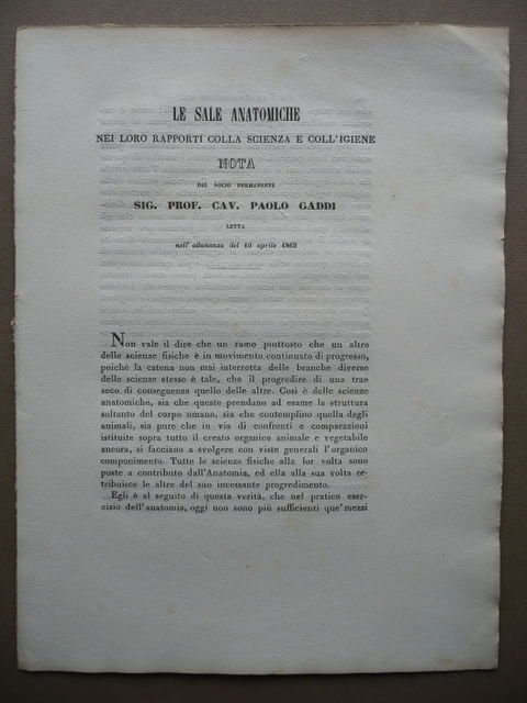 Vedere la descrizione dettagliata Paolo Gaddi, Le Sale Anatomiche Nei loro rapporti colla Scienza e coll'Igiene Nota Del Socio Permanente Sig. Prof. Cav. Paolo Gaddi Letta Nell'Adunanza del 10 Aprile 1863 Data la mancanza della brossura non è possibile risalire all'editore/stampatore, 1863, cm 30x23, pp. 14, mancanza della brossura. Opuscolo completo. Condizioni di conservazione Esemplare in discrete condizioni, mancanza della brossura con conseguente allentamento dei fascicoli (i quali sono uniti da un unico punto di cucitura), lievi bruniture, margini con barbe, angolo sup. con leggerissima traccia di pieghetta. Interni intonsi. Opuscolo mancante di brossura ma dagli interni ben conservati, intonsi. Testo relativo alle caratteristiche e alla tipologia di struttura più adatta alle Sale Anatomiche e alla loro funzione. SC03.D8321 MT Per libri e documenti su questo e altri argomenti visitate il nostro negozio Libreria Grandangolo" Data l'importanza delle 5 stelle rilasciate durante l'assegnazione del feedback, invitiamo tutti gli acquirenti, se soddisfatti del loro acquisto, a rilasciare tutte le 5 stelle. La mancanza anche solo di una stella illuminata è molto lesiva per noi venditori professionali. Grazie! CONDIZIONI DI VENDITA Spedizione Fino a 5 kg piego di libri raccomandato, oltre i 5 kg pacco postale. Si ricorda che l'imballo viene eseguito con la massima cura. La merce viene spedita a pagamento avvenuto e viaggia a rischio e pericolo dell'acquirente. Per maggiori informazioni vedi la pagina SPEDIZIONI del nostro negozio. Ritiro diretto Siamo disponibili per il ritiro diretto a Modena e a Milano. Per gli indirizzi delle sedi vedi la pagina DOVE SIAMO del nostro negozio. Acquisti multipli Se si acquistano più libri, la spedizione si paga una sola volta, purché si rispettino gli scaglioni di peso. Estero / Foreign For international shipment, please contact us. Metodo di pagamento Pay Pal, bonifico bancario, versamento postale (cc/p, vaglia o altro). La spedizione avverrà entro i primi 4 giorni lavorativi dopo la conferma di avvenuto pagamento. Si emette ricevuta fiscale e a richiesta fattura. Il pagamento deve essere effettuato entro 7 giorni lavorativi dalla data di acquisto, trascorsi i quali l'oggetto sarà rimesso in vendita. Feedback Viene rilasciato dall'acquirente dopo il ricevimento di quanto acquistato. Data la sua importanza, vi invitiamo a leggere il breve testo della pagina FEEDBACK del nostro negozio. Pertanto, in caso di qualsiasi problema, non esitate a contattarci. Diritto di recesso L'acquirente ha il diritto di restituire l'oggetto entro 14 giorni ed essere rimborsato, escluse le spese di porto e imballo. L'oggetto deve essere restituito, dopo previa comunicazione, imballato e nelle medesime condizioni di come era all'origine. "
