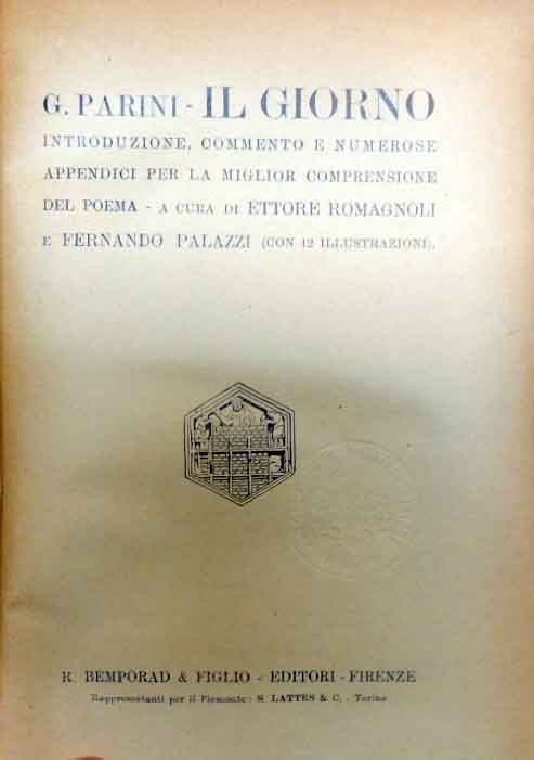 Giuseppe Parini, Il giorno, introduzione, commento e numerose appendici per la miglior comprensione del poema, a cura di Ettore Romagnoli e Fernando Palazzi, con 12 illustrazioni, R. Bemporad e Figlio Editori, Firenze 1925, pp. 338, 10 c. di tavv. f.t. ill. b.n., cm 20, legatura in mezza tela muta con titolo manoscritto al dorso. Segnatura di collocazione alla pagina di guardia e all’occhiello. All’occhiello, bollo: “Per la battaglia del libro”. Minime tracce d’uso alla brossura, lievi fioriture, qualche annotazione manoscritta in bella grafia, per il resto ben conservato.