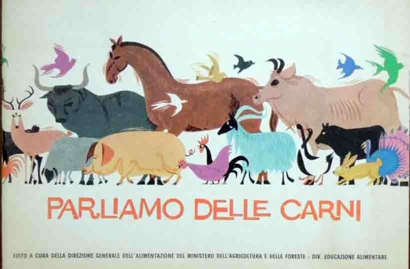 Parliamo delle carni, a cura della Direzione Generale dell’Alimentazione del Ministero dell’Agricoltura e delle Foreste – Div. Educazione Alimentare, s.n., s.l. (ma stampato a Roma, presso la Olimpia S.p.A.) 1968, seconda rist., pp. 48, ill. col., cm 24x17, pubblicazione spillata. Le ricette contenute nel volume sono in parte state tratte da Il talismano della felicità di Ada Boni. Impaginazione e disegni dello Studio Favalli di Roma. Minime bruniture alla brossura, per il resto ben conservato.