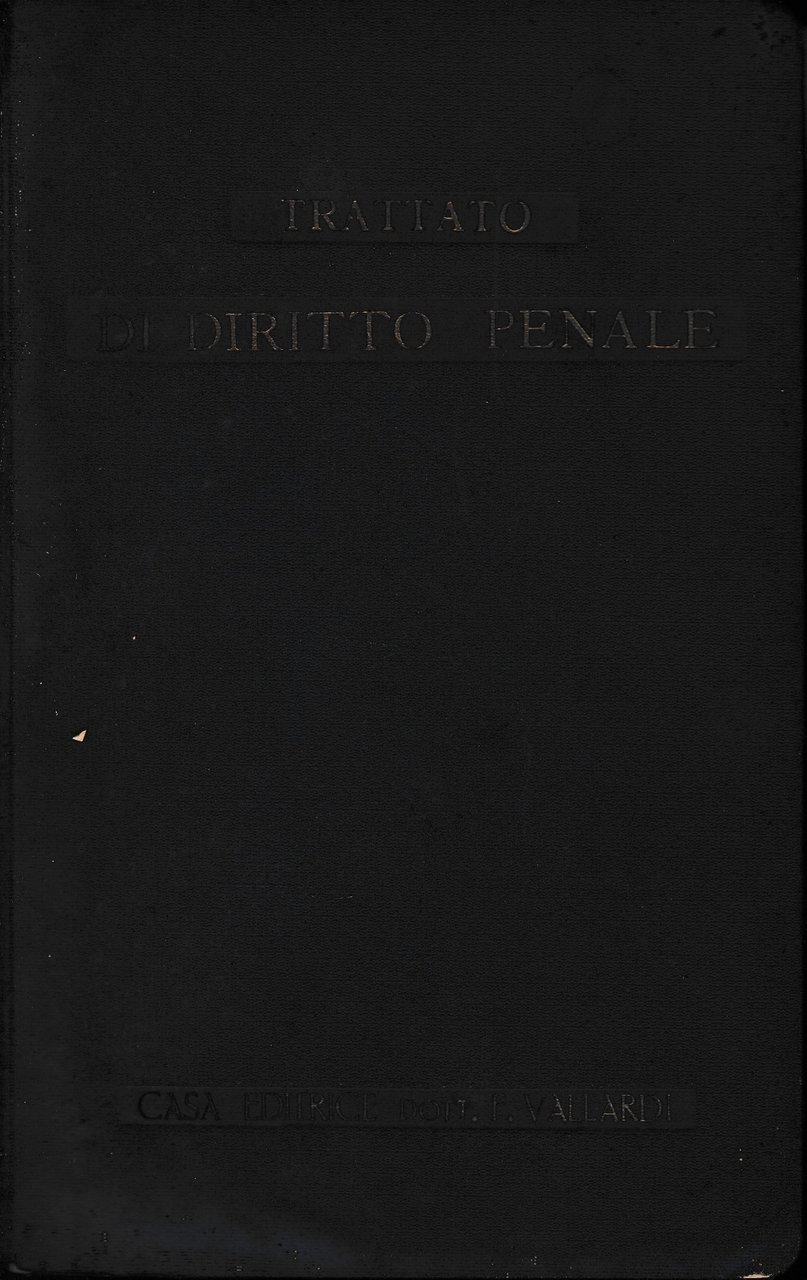 Copertina in plastica uso tela, sporca, con titolo in oro al dorso (ossidato) e piatto, dorso usurato con strappo lungo le cerniere. Tagli e pagine ingialliti, con gore da umidità ad alcune pagine. Collana: “Trattato di diritto penale". LIII+672 Mediocre (Poor) .
